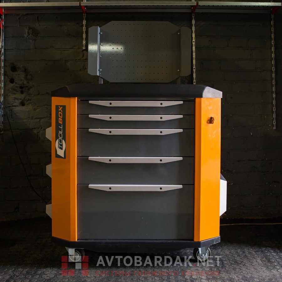 На фотографии: Подкатной стеллаж с 5 выдвижными ящиками серии Premium. 2 ряда полок (верхний глубиной 520 мм, нижний 315 мм). Рейлинг с крюками для подвеса электроинструментов. Перфорированная панель с набором крючков Больше фото и видео стеллажей для инструментов вы найдете в галерее.