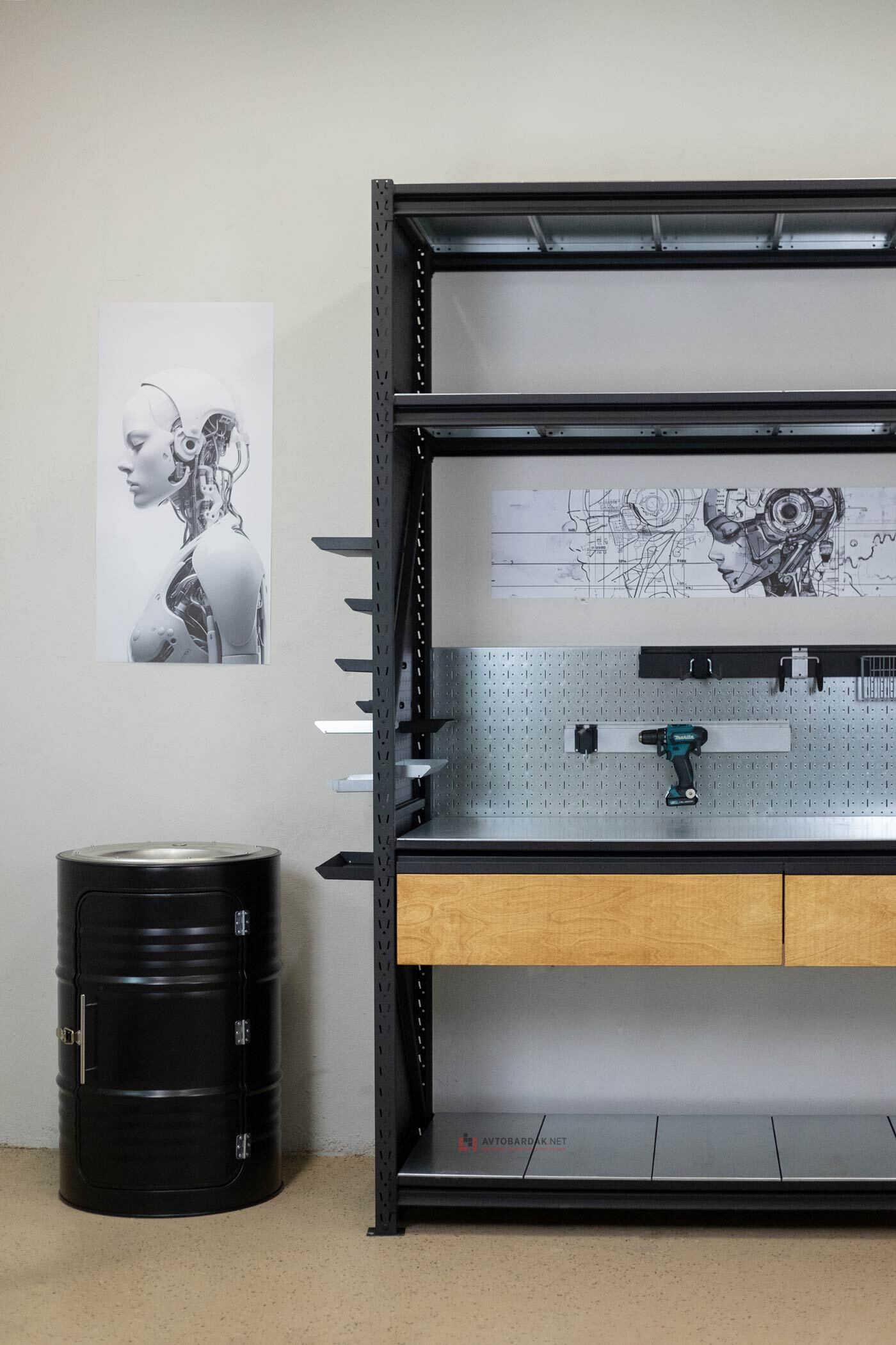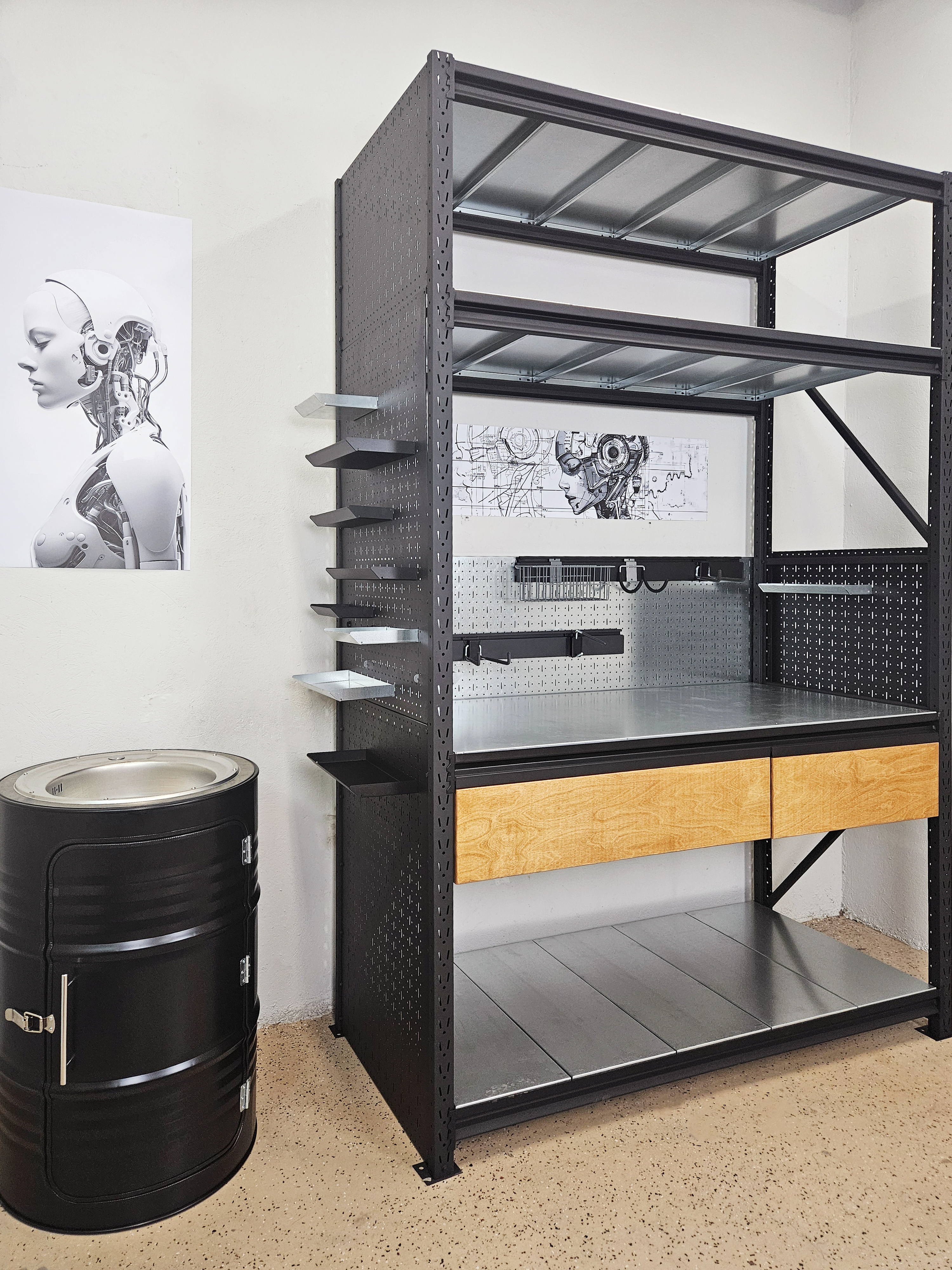 Бочку красим порошком в черный цвет (9005 муар). Столешницу покрываем маслом в расцветках Орех и Махагон - базовые цвета.