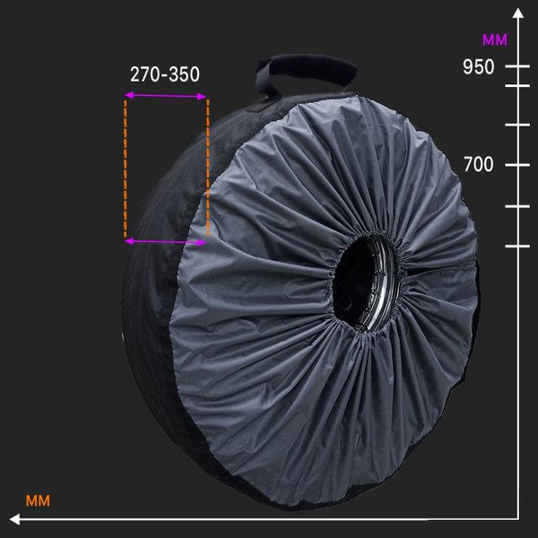 Чехлы вмещают колеса диаметром от 700 до 950 мм, что ориентировочно соответствует Гигантским колесам больше R21 (или 36 или 38 дюймовым колесам) с поправкой на высоту профиля колеса, поэтому рекомендуем замерить диаметр колеса от края до края.