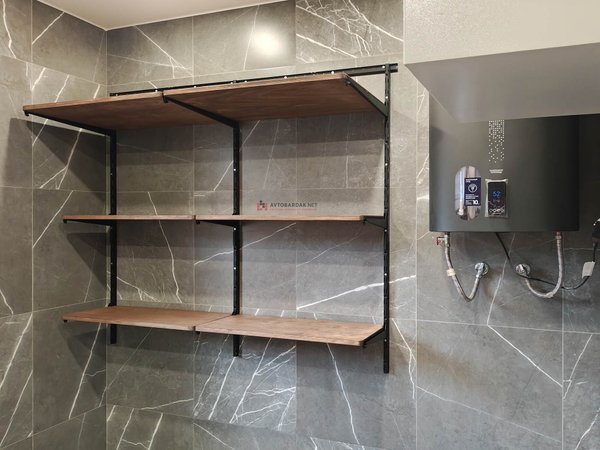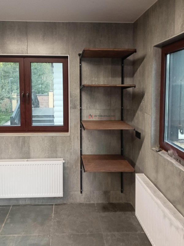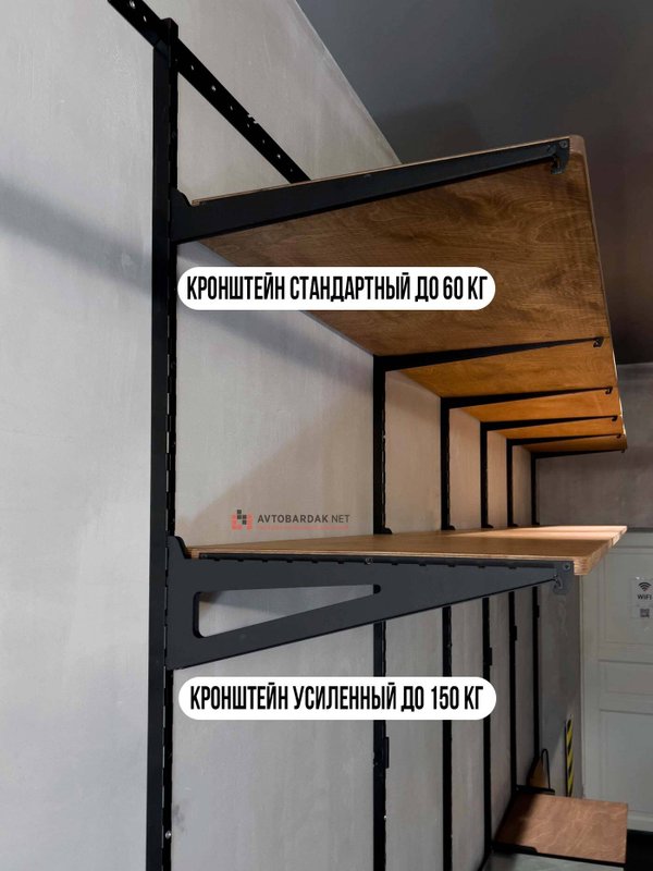 Максимальная нагрузка на каждую полку 115 кг. Нагрузка на одну полку, которая лежит на двух кронштейнах 115 кг. Обратите внимание, что если полка лежит в ряду других деревянных полок, то две полки лежат на трех кронштейнах. В этом случае нагрузка на одну полку будет 80 кг.