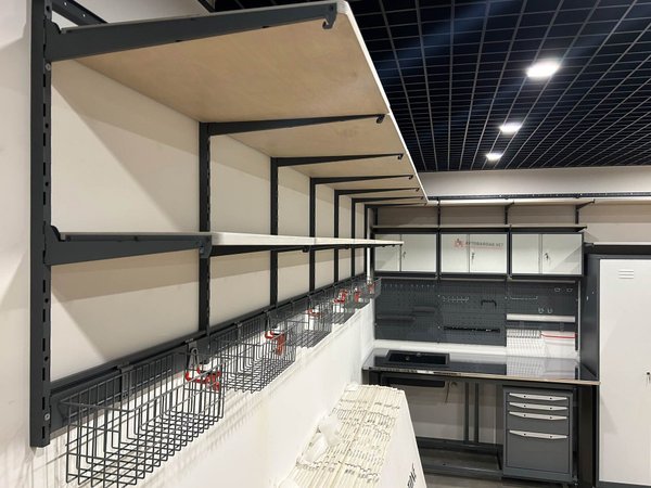 Рабочая зона 4,4 м в длину (2 рабочих места: три верстака, ящики и перфопанели для инструментов). Раковину из нержавейки с смесителем и сифоном, слив в полу устанавливал местный сантехник, мы только подготовили вырез в столешнице под раковину. По этой же стене в углу у въездных ворот место для керхера, инструмент для уборки, корзины для химии. Центральная стена: 2 шкафа для хранения одежды (боковины покрашены в черный цвет), кронштейн для вертикального хранения 2-х велосипедов, 2 полки для колес, кронштейны для хранения длинномеров. Стена справа от въездных ворот: 3 окна, крюк для хранения стремянки (ближе к воротам). Металлические перфорированные полки, усиленные ребрами жесткости по двум стенам. Поэлементная спецификация По ссылке отображается первая страница товарной спецификации. Для просмотра всей сметы целиком, нажмите "Скачать" в левом верхнем углу документа.