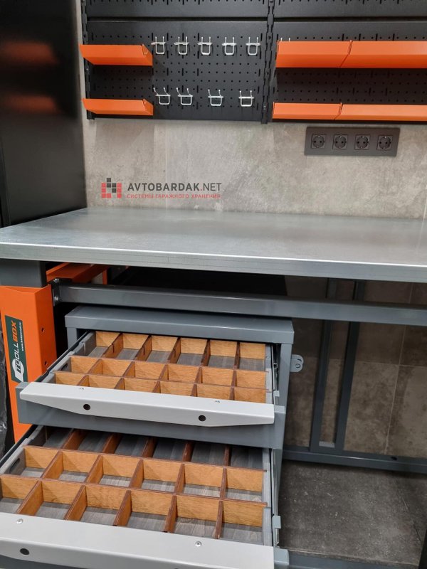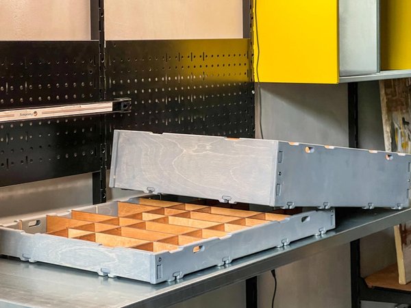 Деревянные ящики совместимы с тумбами серии ТВК (тумбы для усиленных верстаков) - они вставляются в выдвижные ящики тумб.