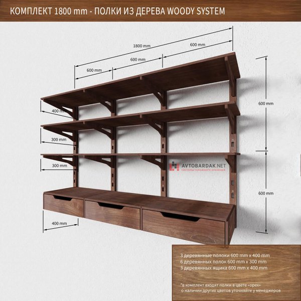 Деревянный стеллаж из темного дерева. Длина 1800 мм. Выдвижные ящики и полки. (набор №60)
