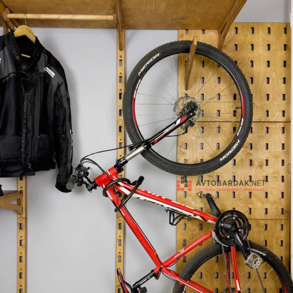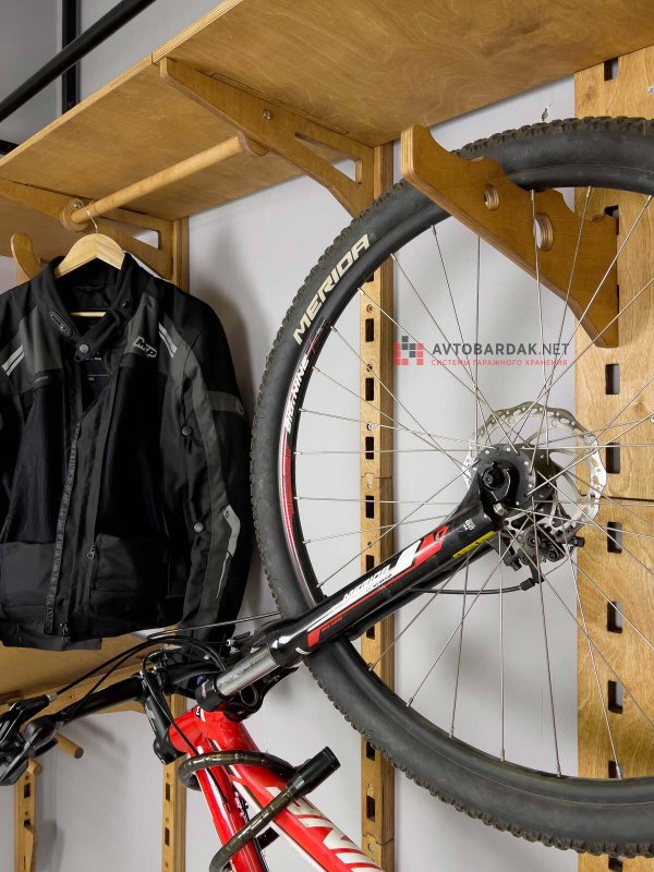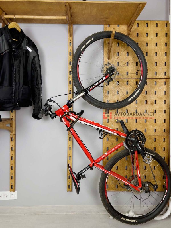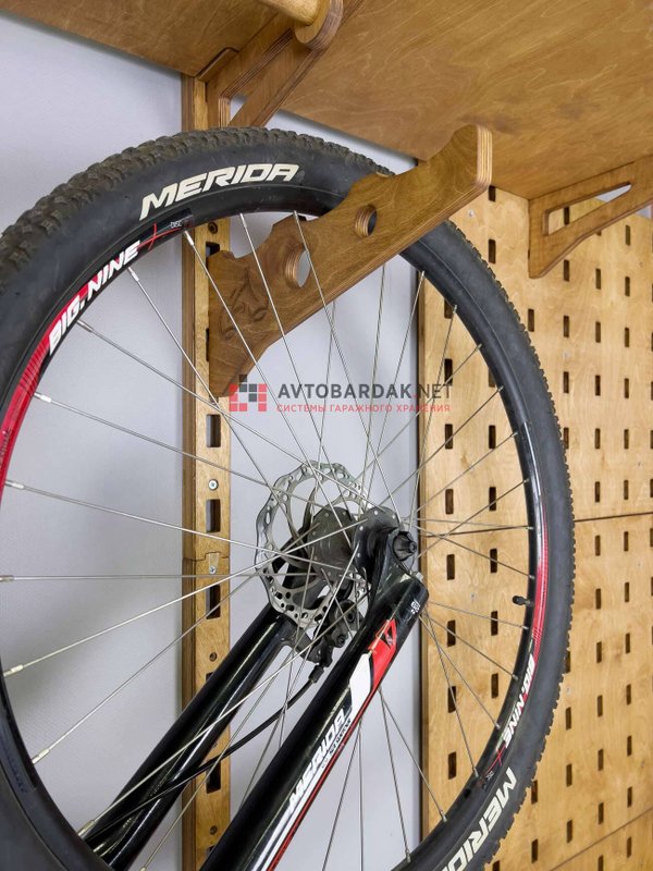 Деревянный кронштейн для подвеса велосипеда вертикально вдоль стены. Велосипед можно подвесить за колесо или за раму в районе вилки (на паре таких кронштейнов можно подвесить велосипед горизонтально - более подробно по ссылке).