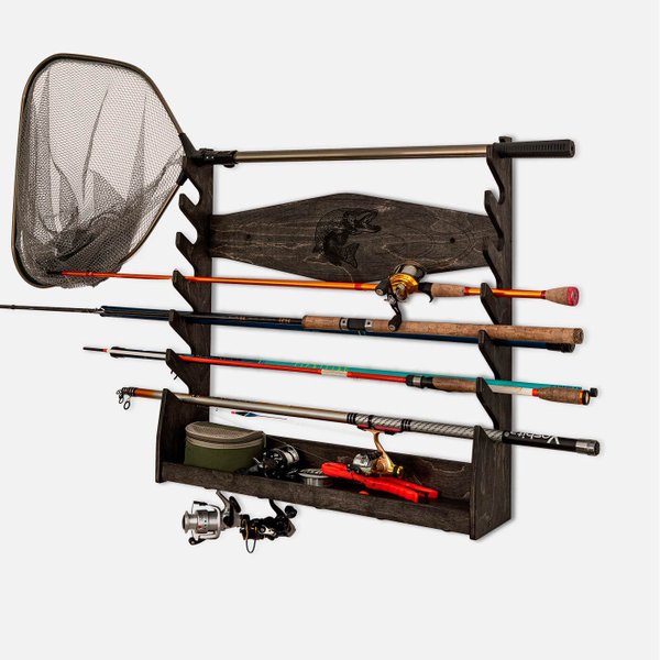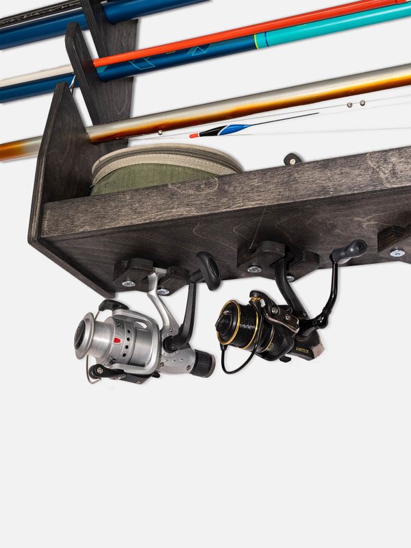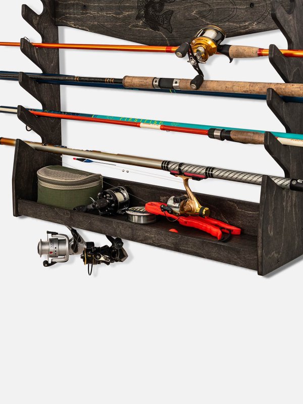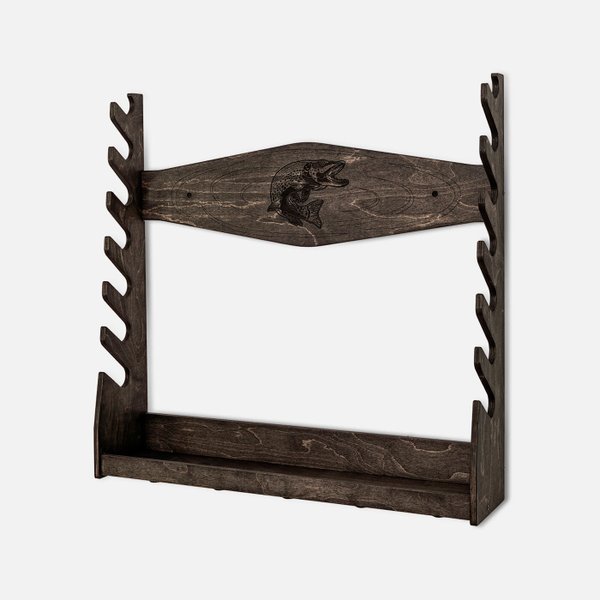 Этот держатель для спиннингов — практичное решение для хранения вашего снаряжения. На нем удобно размещается до 7 удилищ, 5 катушек, а также есть просторная полка (72х14 см) для прочих рыболовных принадлежностей. Конструкция из прочной мебельной фанеры отличается устойчивостью, а сборка не требует особых навыков — все элементы легко соединяются между собой с помощью пазов.
