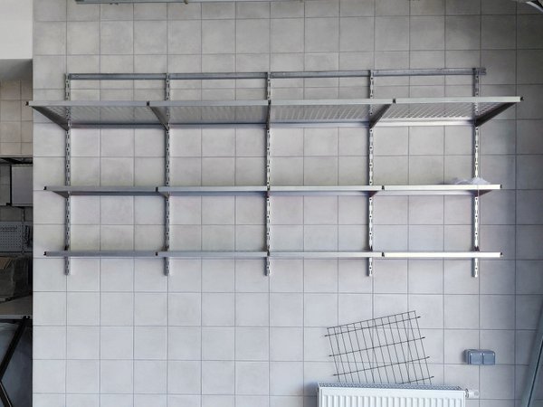 Хорошо закрепленные к стене горизонтальные рейки и вертикальные направляющие создают прочную раму и позволяют хранить большие веса даже на хрупких стенах из пеноблоков. А на стенах из бетона проверенная нагрузка на каждую полку при использовании ребер жесткости и усилителей кронштейнов составляет 180 кг.