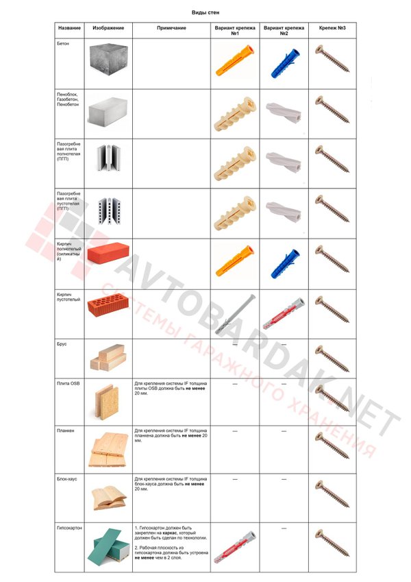 Две таблицы для подбора крепежа для монтажа горизонтальных реек и вертикальных направляющих: варианты саморезов и дюбелей в зависимости от материала стен (бетон, пено и газоблоки, пазогребневые плиты, полнотелый и пустотелый кирпич, дерево, гипсокартон.