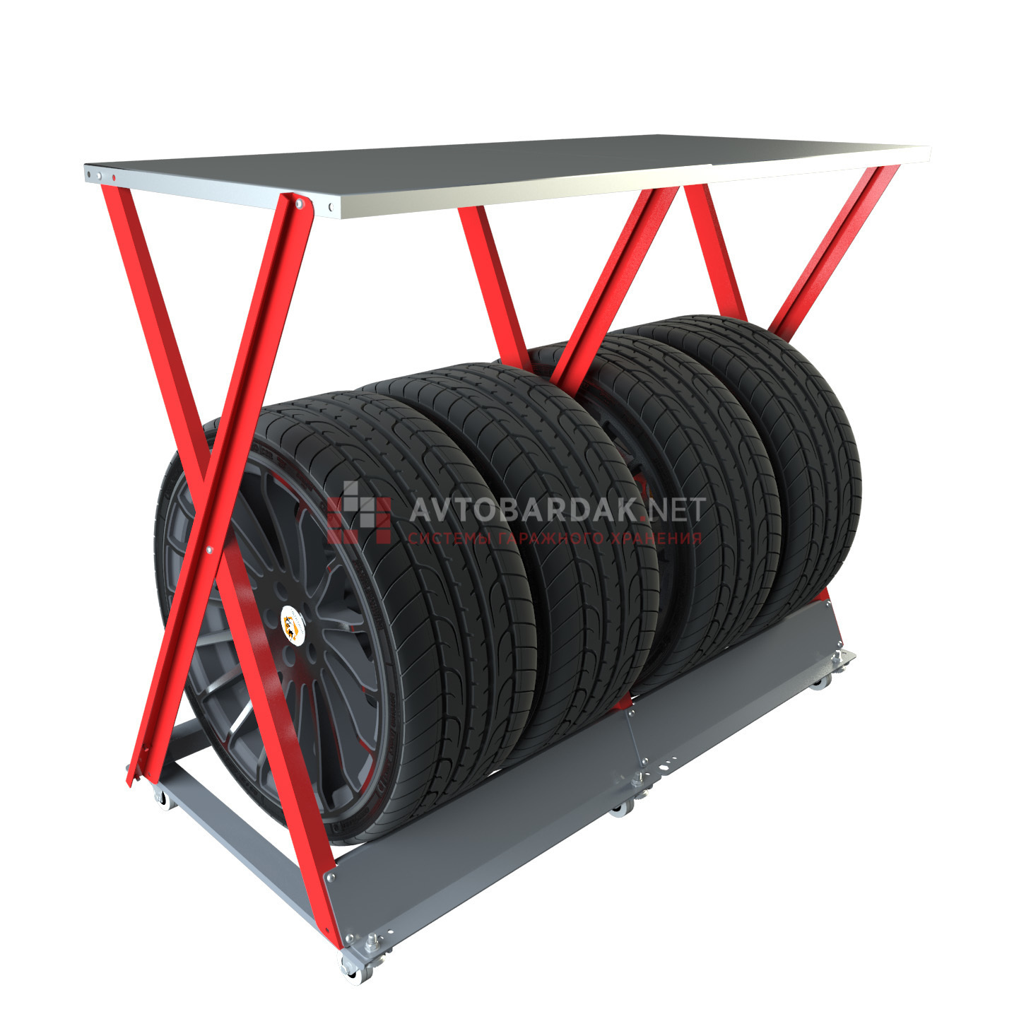 Горизонтальный стеллаж для хранения комплекта шин состоит из двух секций, каждая из которых вмещает 2 колеса.