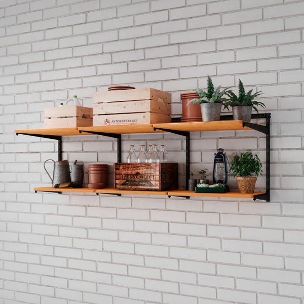 Собрали для вас готовый стеллаж. Два ряда полок. Каждый кронштейн выдерживает до 60 кг нагрузки.
