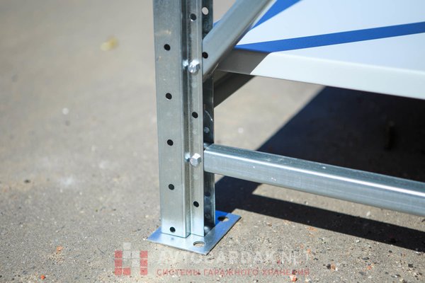 Внимание! Мы внесли изменения в конструкцию напольных стеллажей. Теперь все горизонтальные балки из оцинкованной стали (можно использовать на улице). Горизонтальные балки состоят из трех частей: правого и левого зацепа и самой горизонтальной балки на болтовом соединении, как на фото справа.