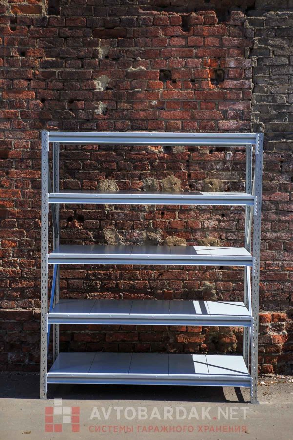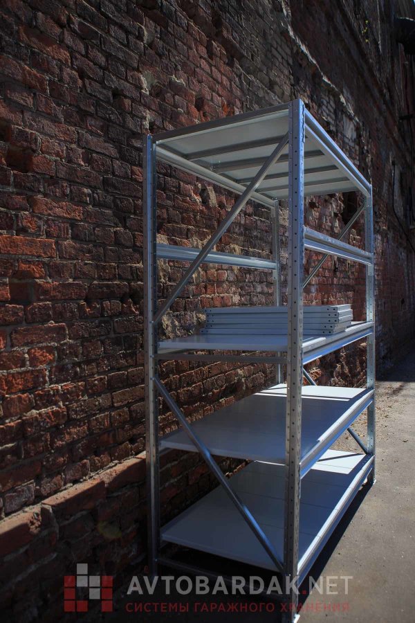 Рама стеллажа – оцинкованная сталь. Горизонтальные балки (на которых лежат полки) сталь, порошковая покраска, цвет серый. Полки на выбор: оцинкованная сталь или сталь с порошковой покраской в серый цвет.