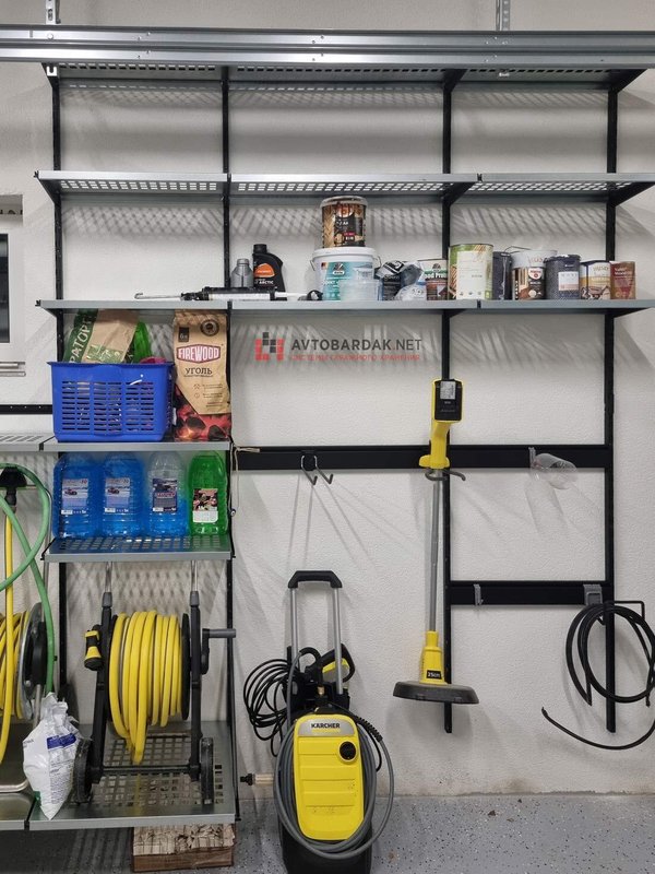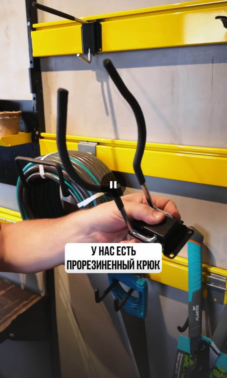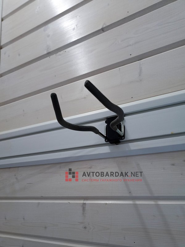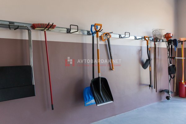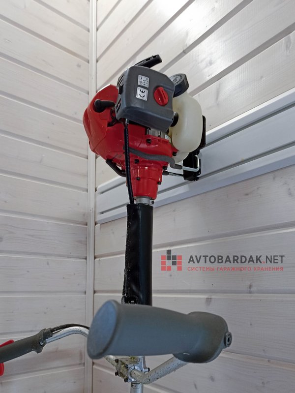 Настенный держатель садового триммера в форме "ухвата". Триммер подвешивается за голову (часть, где двигатель, бак, фильтр).