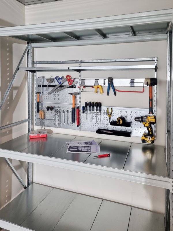 Рабочая зона 4,4 м в длину (2 рабочих места: три верстака, ящики и перфопанели для инструментов). Раковину из нержавейки с смесителем и сифоном, слив в полу устанавливал местный сантехник, мы только подготовили вырез в столешнице под раковину. По этой же стене в углу у въездных ворот место для керхера, инструмент для уборки, корзины для химии. Центральная стена: 2 шкафа для хранения одежды (боковины покрашены в черный цвет), кронштейн для вертикального хранения 2-х велосипедов, 2 полки для колес, кронштейны для хранения длинномеров. Стена справа от въездных ворот: 3 окна, крюк для хранения стремянки (ближе к воротам). Металлические перфорированные полки, усиленные ребрами жесткости по двум стенам. Поэлементная спецификация По ссылке отображается первая страница товарной спецификации. Для просмотра всей сметы целиком, нажмите "Скачать" в левом верхнем углу документа.