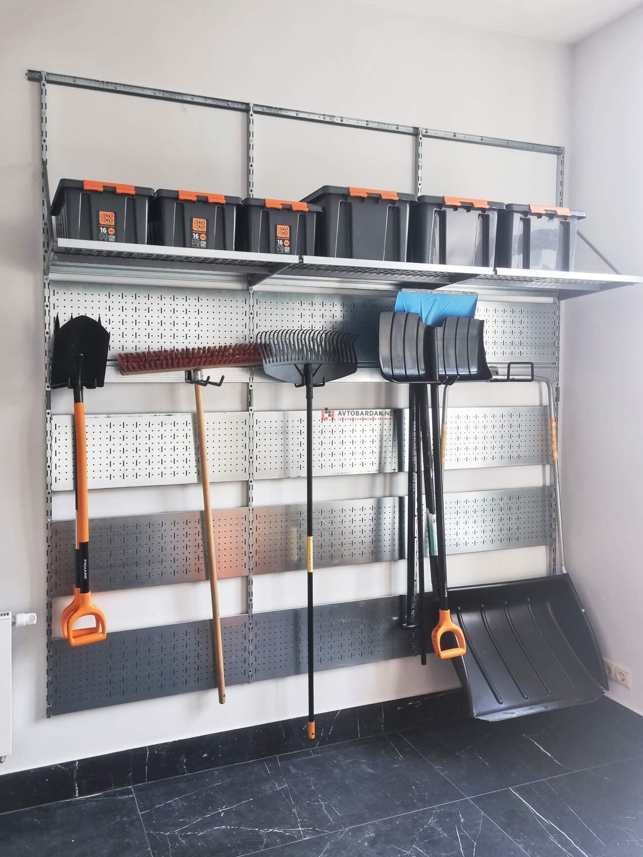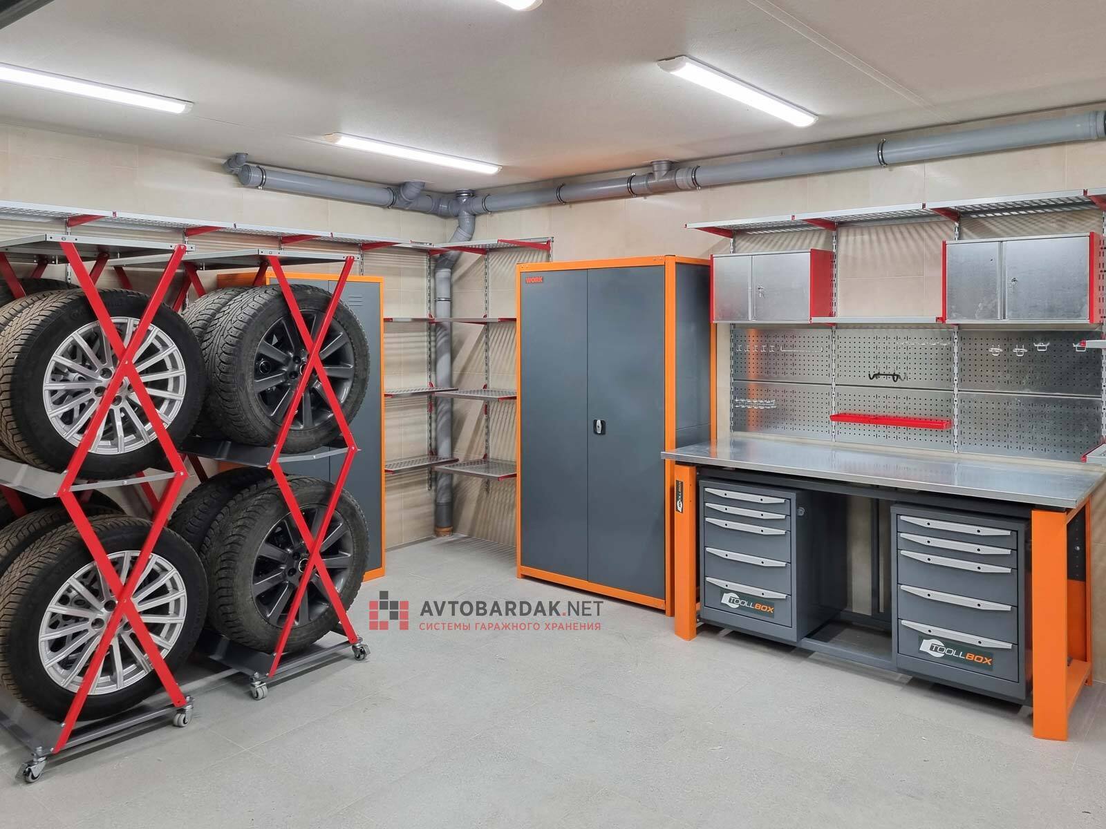 Рабочая зона 4,4 м в длину (2 рабочих места: три верстака, ящики и перфопанели для инструментов). Раковину из нержавейки с смесителем и сифоном, слив в полу устанавливал местный сантехник, мы только подготовили вырез в столешнице под раковину. По этой же стене в углу у въездных ворот место для керхера, инструмент для уборки, корзины для химии. Центральная стена: 2 шкафа для хранения одежды (боковины покрашены в черный цвет), кронштейн для вертикального хранения 2-х велосипедов, 2 полки для колес, кронштейны для хранения длинномеров. Стена справа от въездных ворот: 3 окна, крюк для хранения стремянки (ближе к воротам). Металлические перфорированные полки, усиленные ребрами жесткости по двум стенам. Поэлементная спецификация По ссылке отображается первая страница товарной спецификации. Для просмотра всей сметы целиком, нажмите "Скачать" в левом верхнем углу документа.