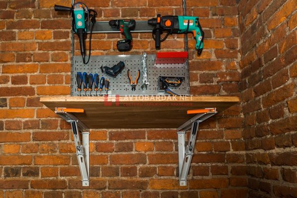 Кронштейны для откидных столов прекрасно подойдут для любых сборочных работ в небольшой домашней мастерской в гараже. Если нужен стол, но нет места для стационарного верстака. В сложенном виде, кронштейны отступают от стены всего на 40 мм!