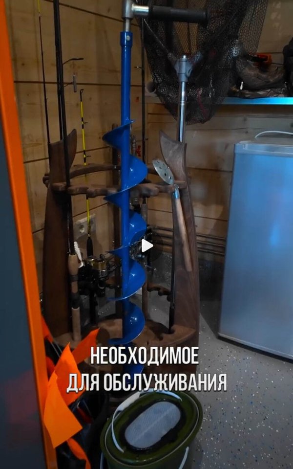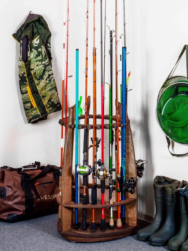 Решение организации пространства для заядлых рыбаков: круговая стойка из дерева для удилищ.