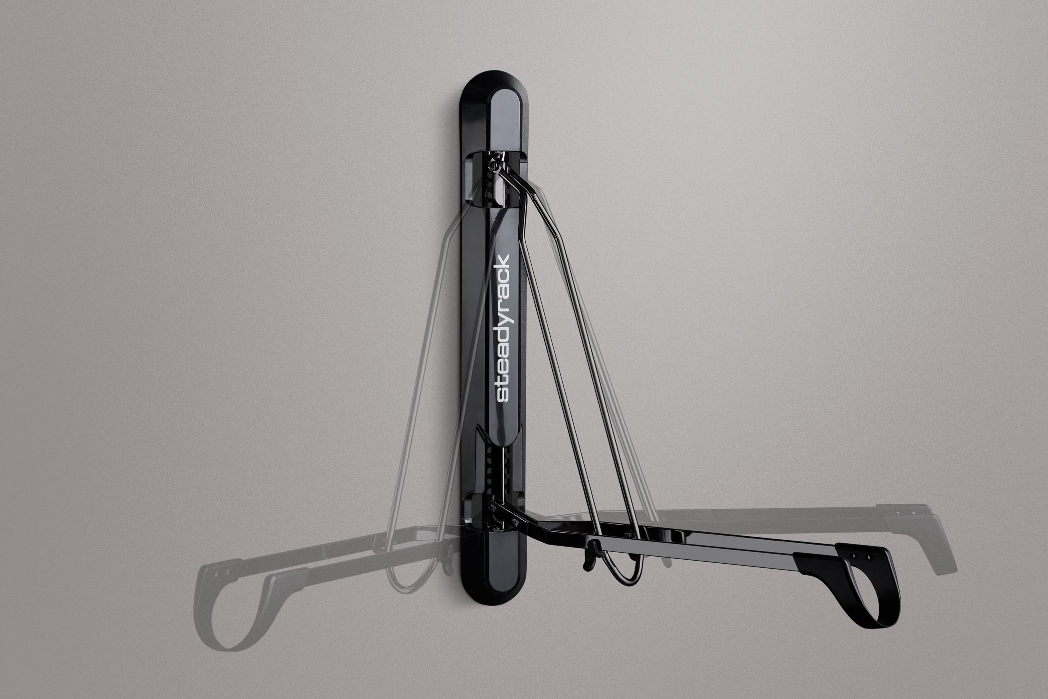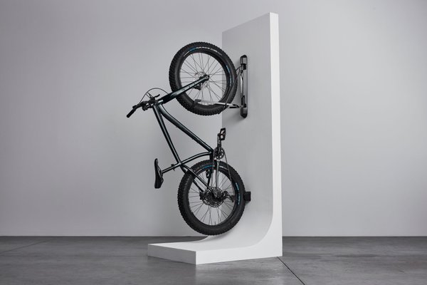 Подвесьте велосипед на установленное крепление. Возьмите подставку и примерьте ее под заднее колесо на стене. Зафиксируйте карандашом метку на стене в верхнем отверстии. Уберите подставку и снимите велосипед. Установите уровень в велокрепление и убедитесь что подставка и крепление находятся на одной оси. Просверлите первое отверстие для подставки. Повесьте ее на один свободный болт. Отметьте второе отверстие, снимите подставку, выровняйте метку с помощью уровня и просверлите оставшееся отверстие. Установите подставку на место и плотно зафиксируйте с помощью креплений.