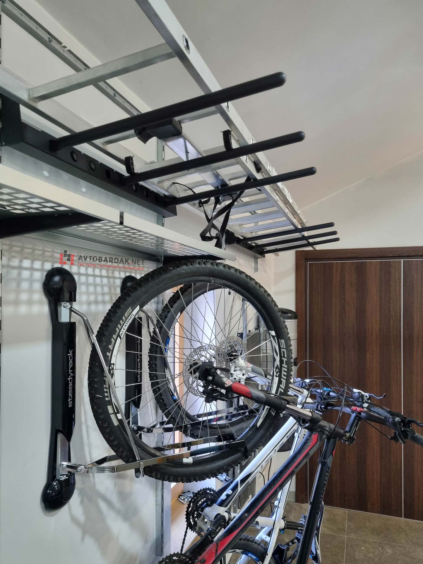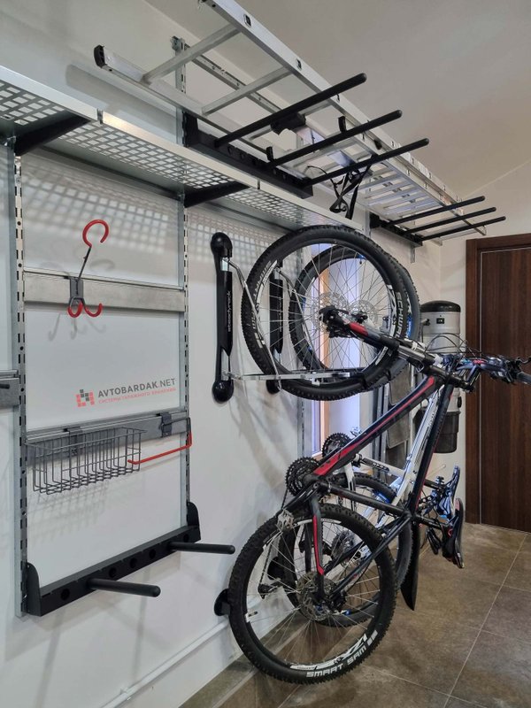 В дополнение к велокреплению вы можете приобрести систему хранения из направляющих и кронштейнов с крюками и лотками для велоаксессуаров (ссылка в разделе сопутствующие товары). Система хранения крепится к стене через крепеж, который идет в комплекте с вело креплением.