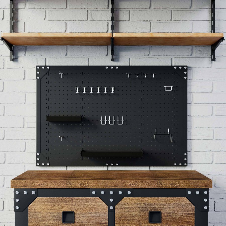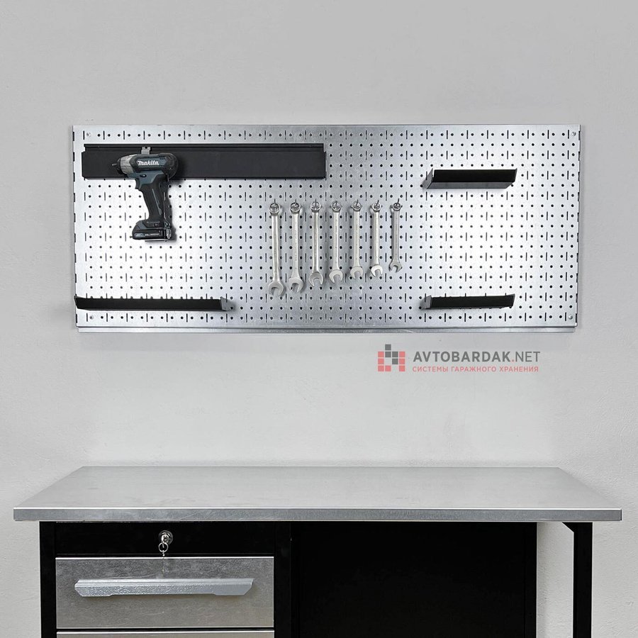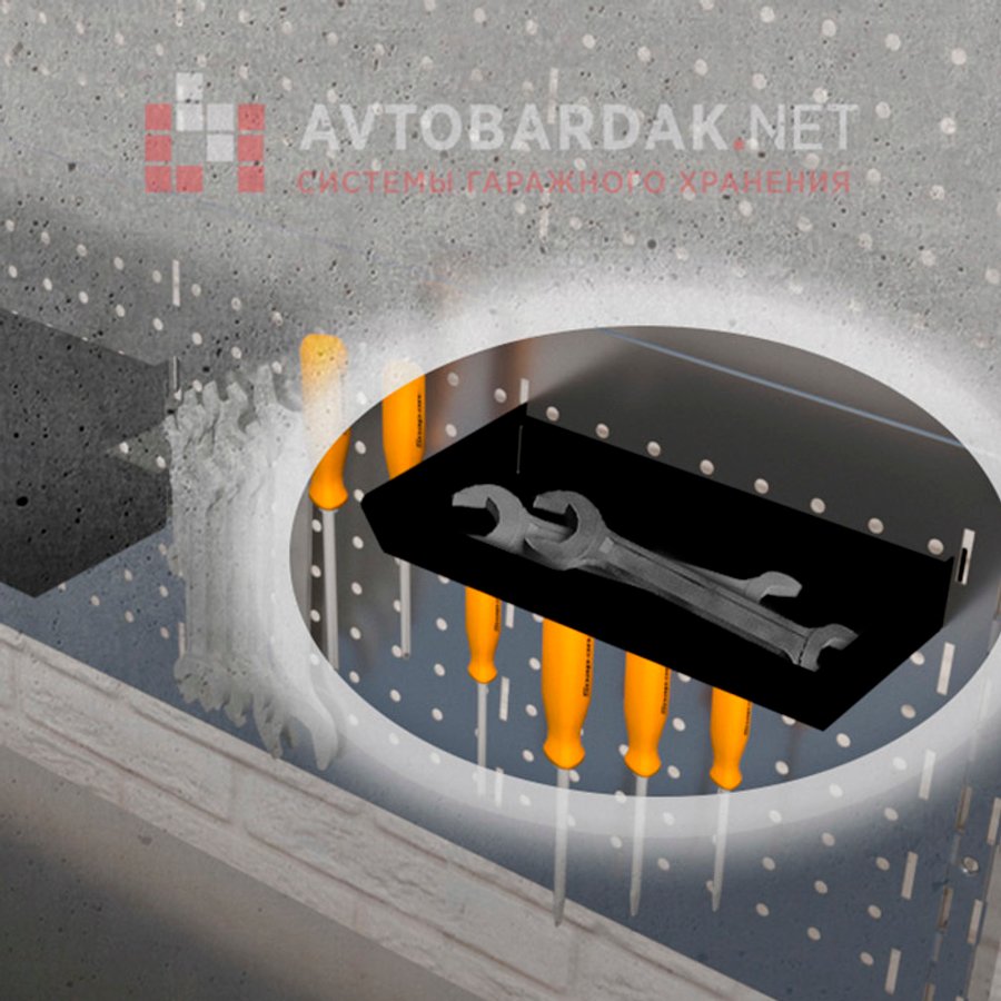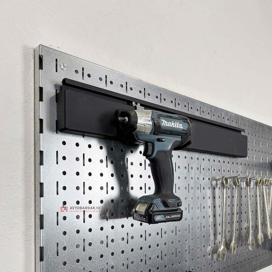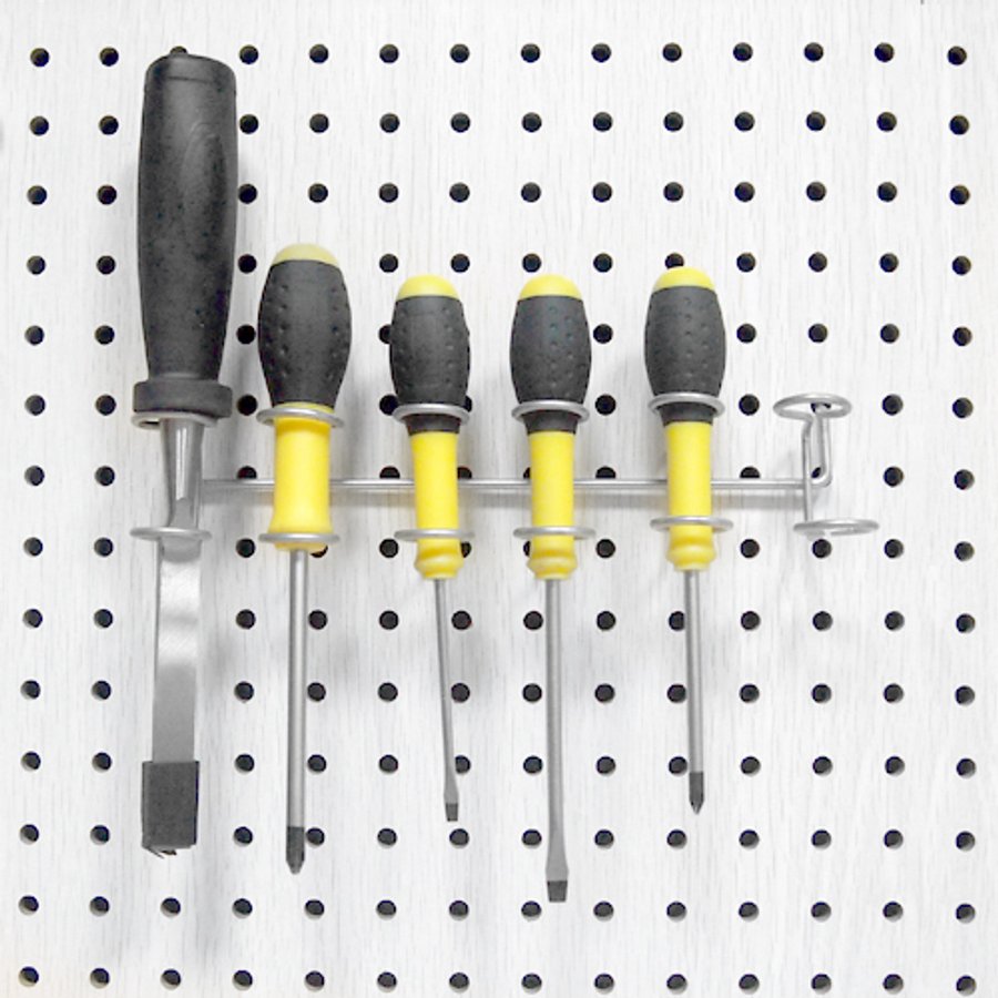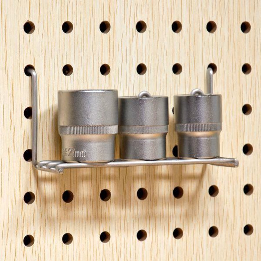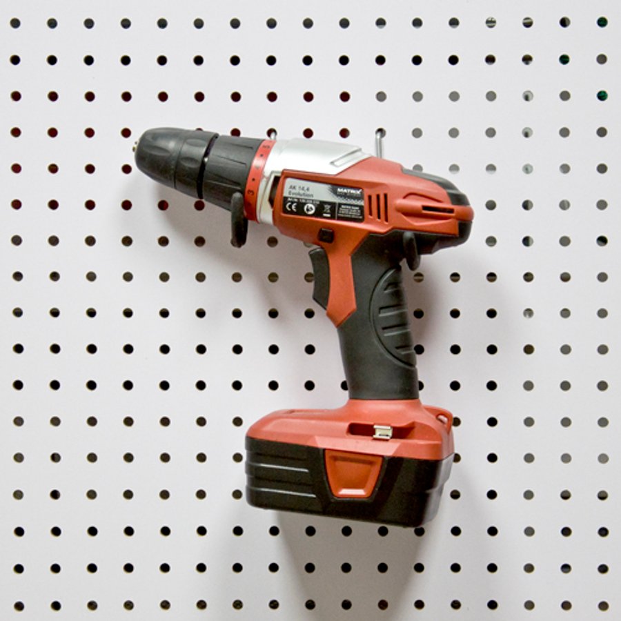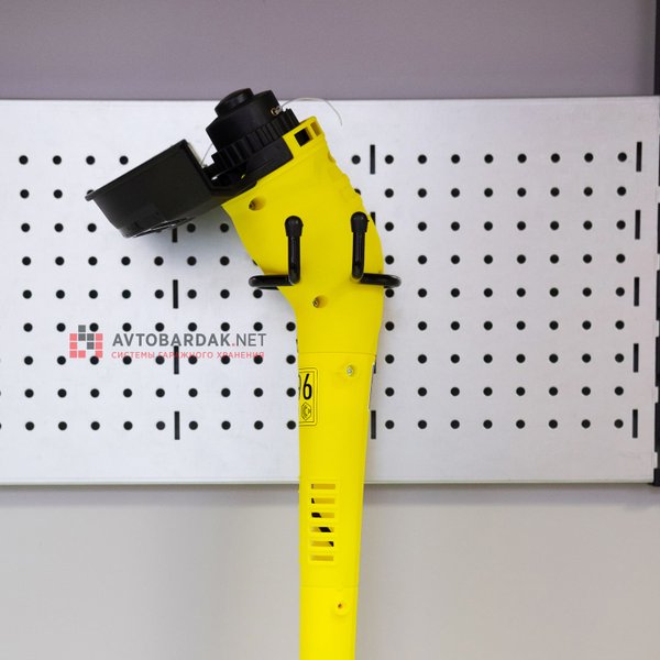 Крюк для подвеса небольшого триммера или другого электроинструмента на металлическую перфорированную панель.