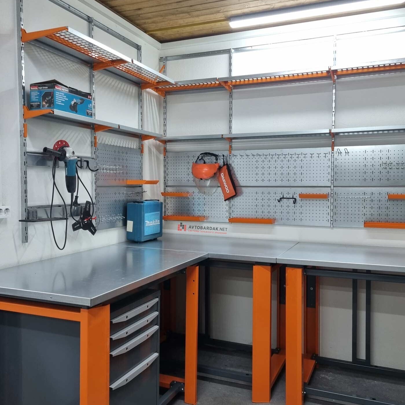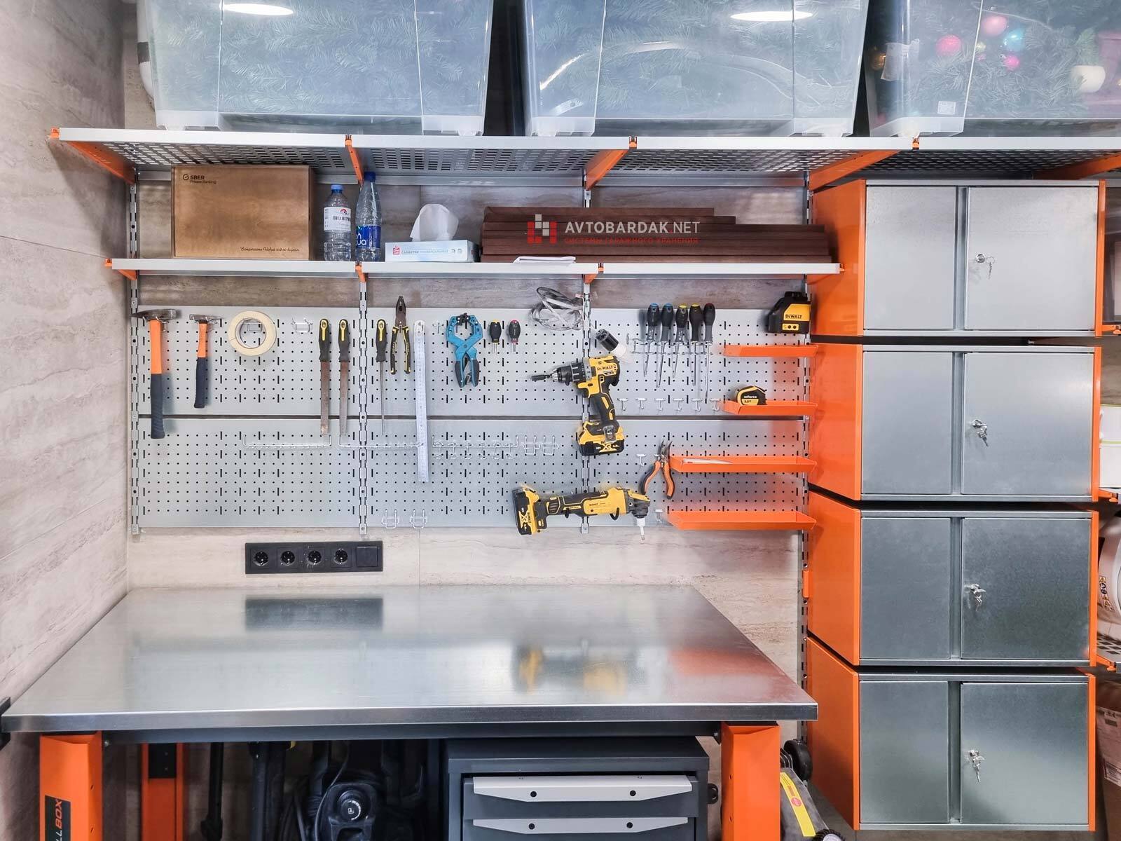 В слайдере множество примеров нашего обустройства мастерских в гаражах и кладовках верстаками и модульными системами хранения.