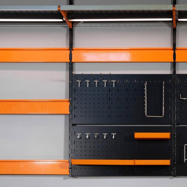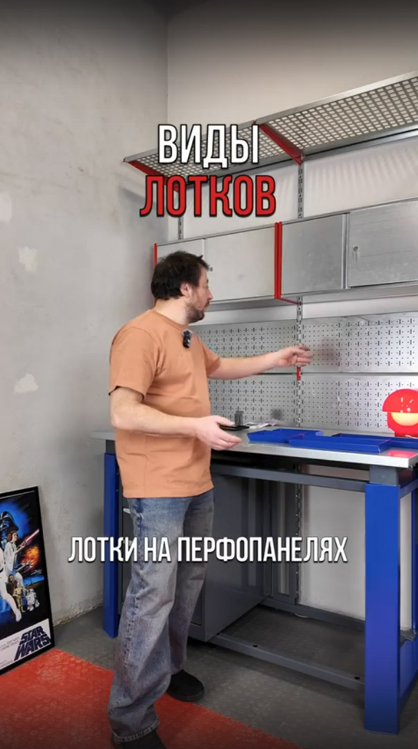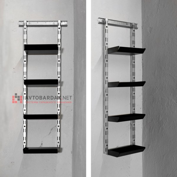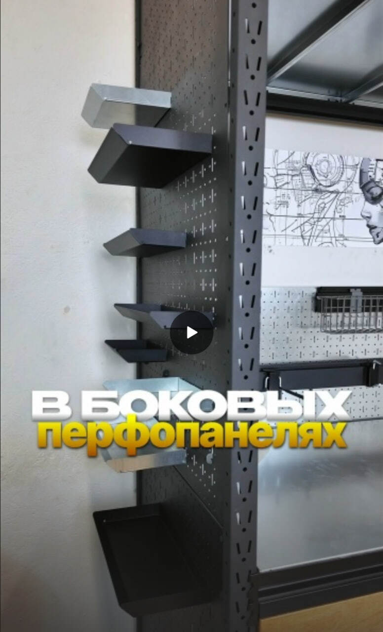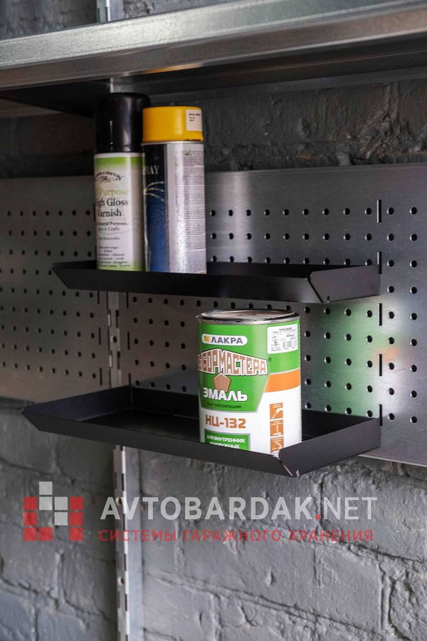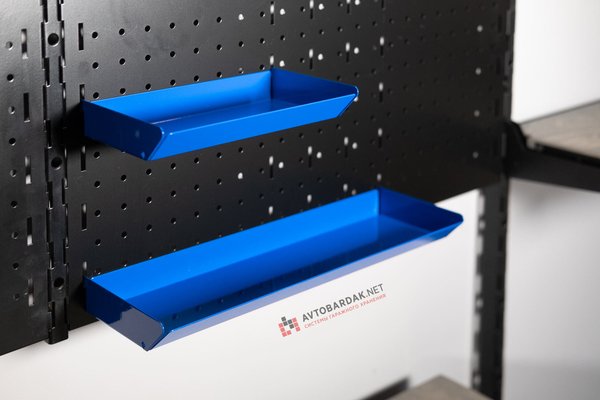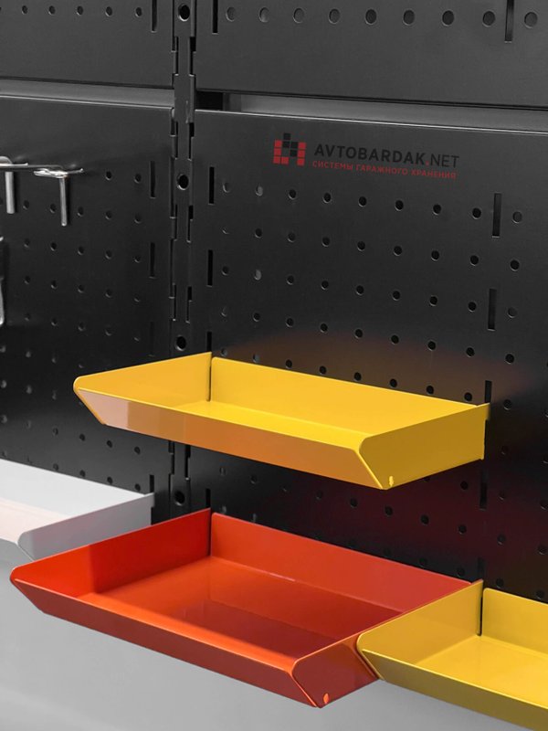 Съемный лоток из металла, порошковая покраска в красный, черный или серый цвет. Лоток предназначен для хранения мелких деталей, может использоваться как дополнительная полка. С тыльной стороны лотка зацепы для крепления на перфорированную панель: легко подвесить, лоток надежно фиксируется на перфопанели, при всем этом он легко снимается.