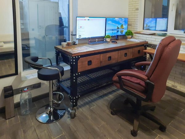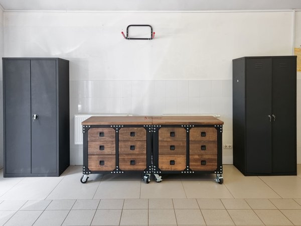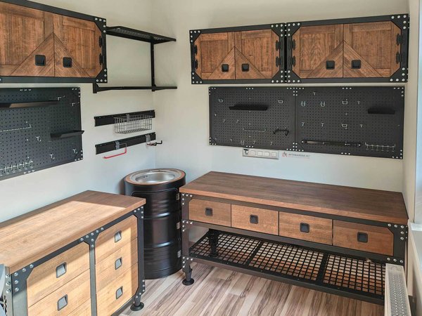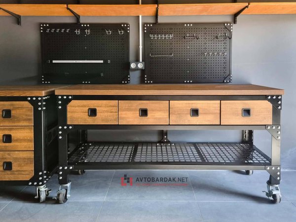 Рабочая зона 4,4 м в длину (2 рабочих места: три верстака, ящики и перфопанели для инструментов). Раковину из нержавейки с смесителем и сифоном, слив в полу устанавливал местный сантехник, мы только подготовили вырез в столешнице под раковину. По этой же стене в углу у въездных ворот место для керхера, инструмент для уборки, корзины для химии. Центральная стена: 2 шкафа для хранения одежды (боковины покрашены в черный цвет), кронштейн для вертикального хранения 2-х велосипедов, 2 полки для колес, кронштейны для хранения длинномеров. Стена справа от въездных ворот: 3 окна, крюк для хранения стремянки (ближе к воротам). Металлические перфорированные полки, усиленные ребрами жесткости по двум стенам. Поэлементная спецификация По ссылке отображается первая страница товарной спецификации. Для просмотра всей сметы целиком, нажмите "Скачать" в левом верхнем углу документа.
