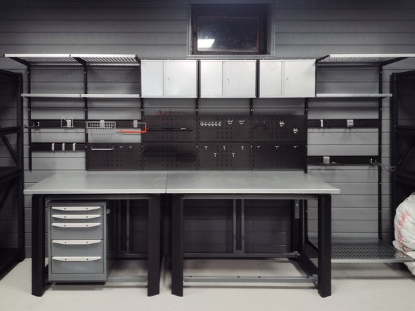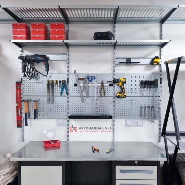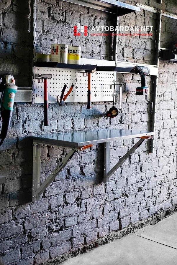 С подвесом на стойки напольных стеллажей (если нет возможности сверлить стену). С помощью модульной системы напольных стеллажей можно организовать идеальное рабочее место с полноценным верстаком и системой хранения инструментов.