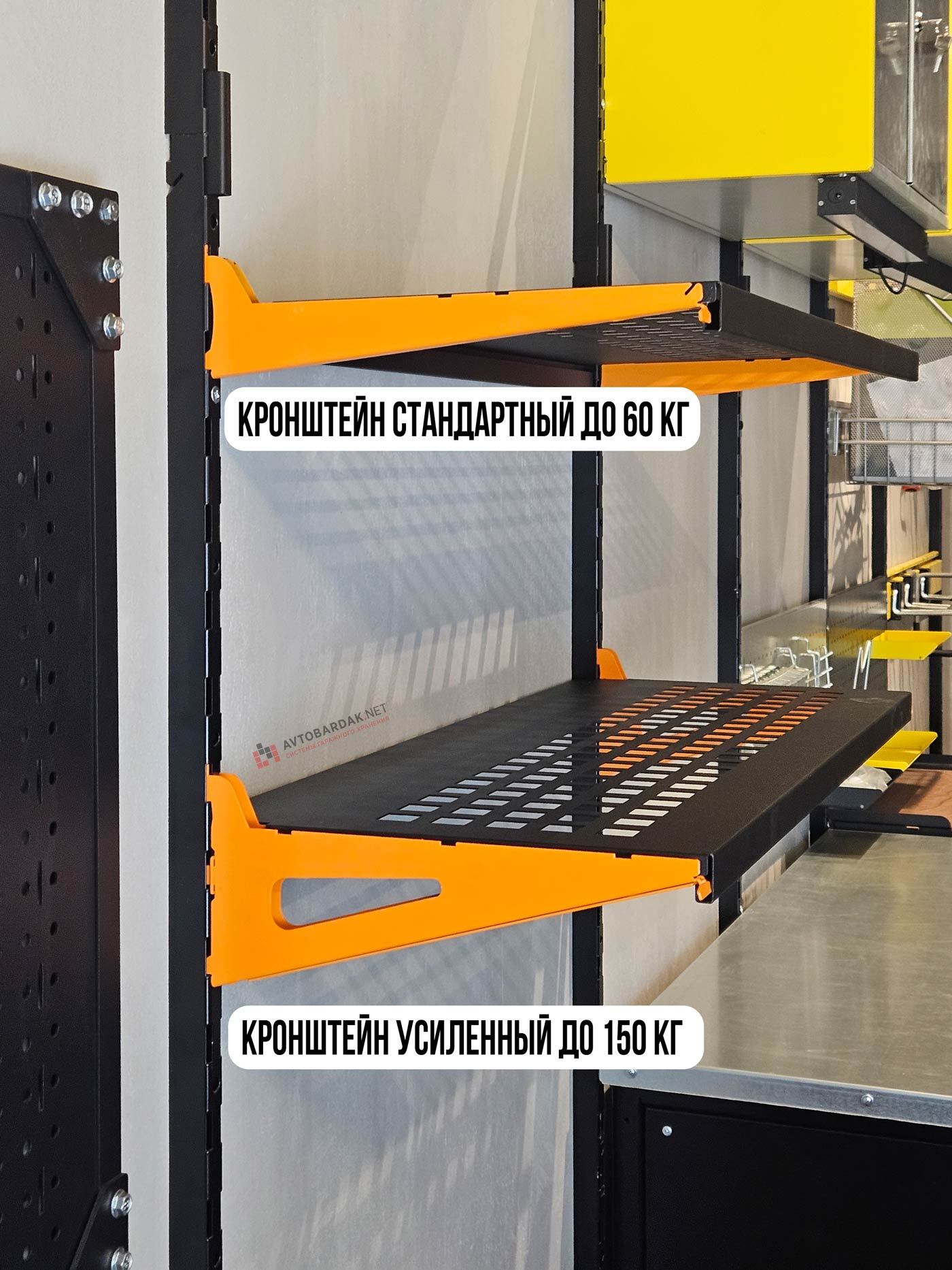 (Для хранения очень тяжелых предметов с точечной нагрузкой более 60 кг, необходимо использовать систему усиления: ребра жесткости и усилители кронштейнов. И их помощью полку можно нагружать до 180 кг).