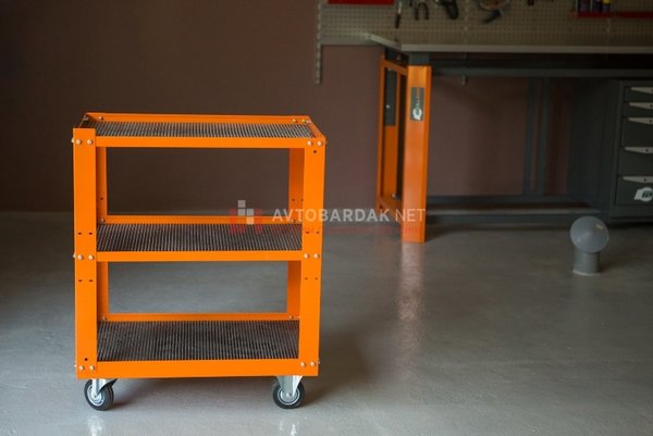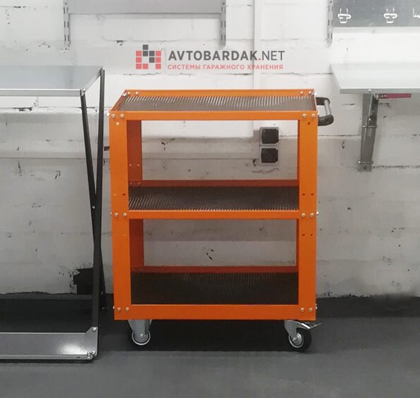 3 полки, нагрузка на полку до 30 кг, тележка с тормозом.