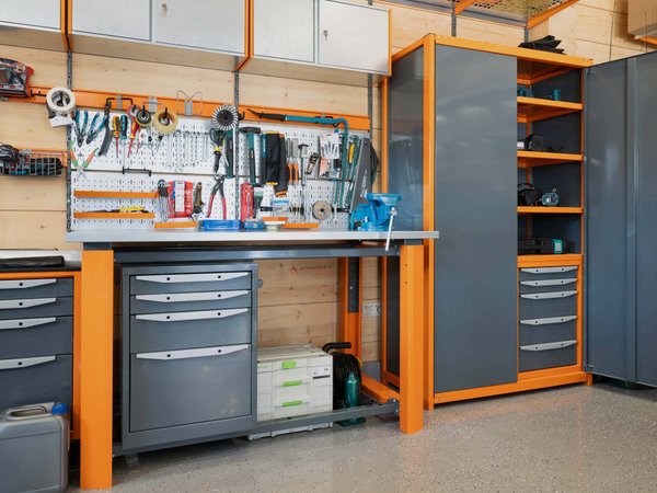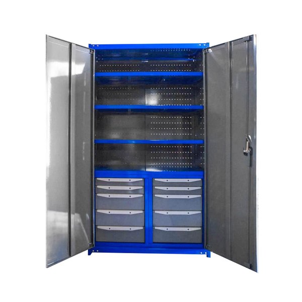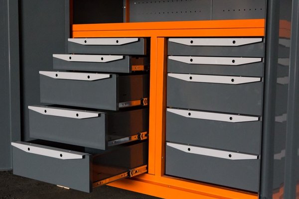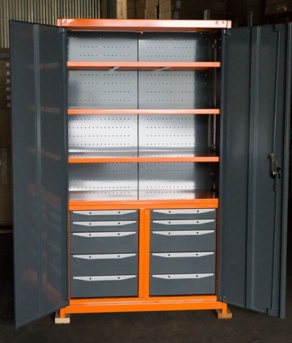 Инструментальный шкаф для гаража и мастерской с 2 тумбами по 5 выдвижных ящиков в каждой и 3 полками сверху. Шкаф закрывается на ключ.