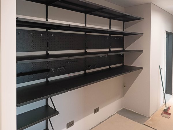 Металлические полки, перфорированные панели для хранения инструментов, рейлинги, ящики и шкафы, модули и кронштейны для шин и любого инвентаря от рабочего до спортивного.