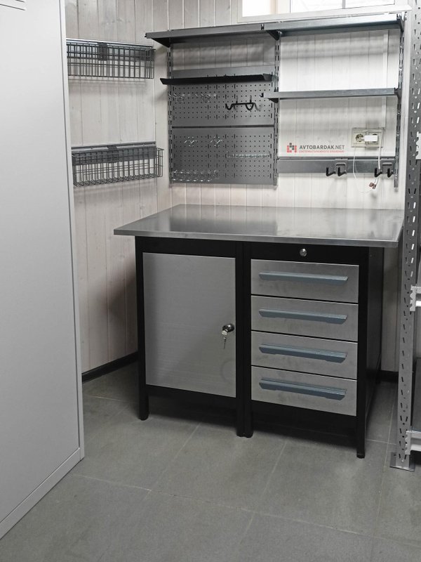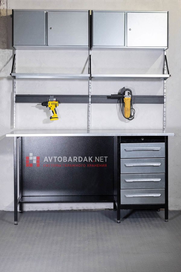 Верстак может комплектоваться или тумбами с 4 выдвижными ящиками или тумбами с дверцей с полкой внутри или ножками опорами и комбинироваться любыми из этих вариантов (два исключения: верстак длиной 1605 и 2005 не может комплектоваться ножками-опорами сразу с двух сторон и на верстак длиной 2005 мм не могут вообще быть установлены ножки-опоры в связи с тем, что в этих случаях у столешницы образуется слишком большой пролет).