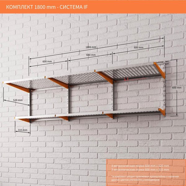 Металлические полки выдерживают до 60 кг равномерно распределенной нагрузки. Или до 180 кг при установке системы усиления на полку. Полки могут быть 600 мм или 800 мм по длине. По глубине полки делятся на 200 мм, 315 мм и 520 мм.