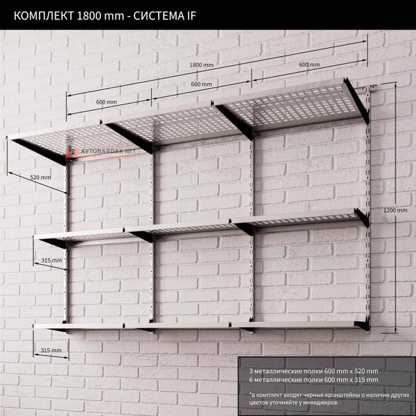 Металлические полки выдерживают до 60 кг равномерно распределенной нагрузки. Или до 180 кг при установке системы усиления на полку. Полки могут быть 600 мм или 800 мм по длине. По глубине полки делятся на 200 мм, 315 мм и 520 мм.