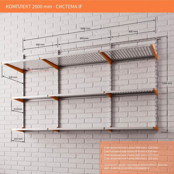 Металлические полки выдерживают до 60 кг равномерно распределенной нагрузки. Или до 180 кг при установке системы усиления на полку. Полки могут быть 600 мм или 800 мм по длине. По глубине полки делятся на 200 мм, 315 мм и 520 мм.