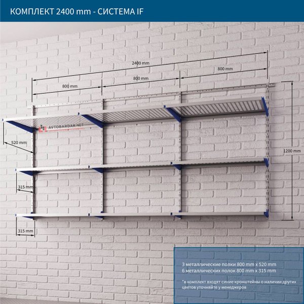 Металлические полки выдерживают до 60 кг равномерно распределенной нагрузки. Или до 180 кг при установке системы усиления на полку. Полки могут быть 600 мм или 800 мм по длине. По глубине полки делятся на 200 мм, 315 мм и 520 мм.