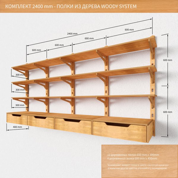 Стеллаж из дерева с выдвижными ящиками и полками. Длина 2400, высота 1200 мм (набор №58)