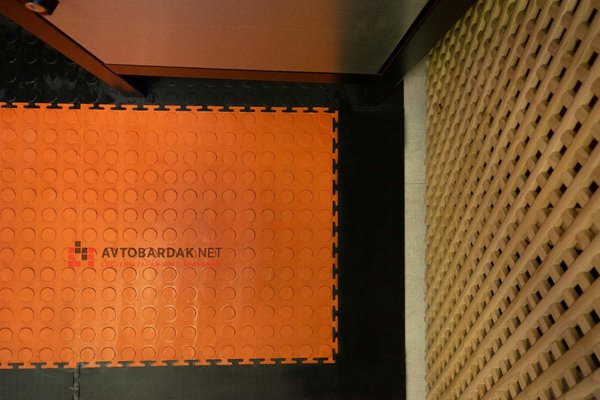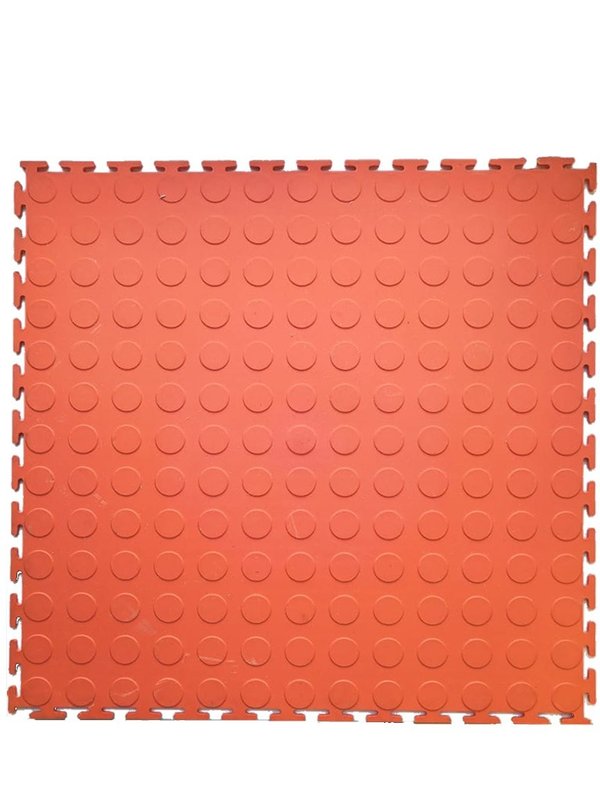 Цвет оранжевый (также в нашем ассортименте можно приобрести напольные плитки ПВХ черного, оранжевого, красного, бежевого, синего, зеленого и серого цвета), антискользящая поверхность, фактура в виде монетки и ребристая.
