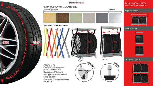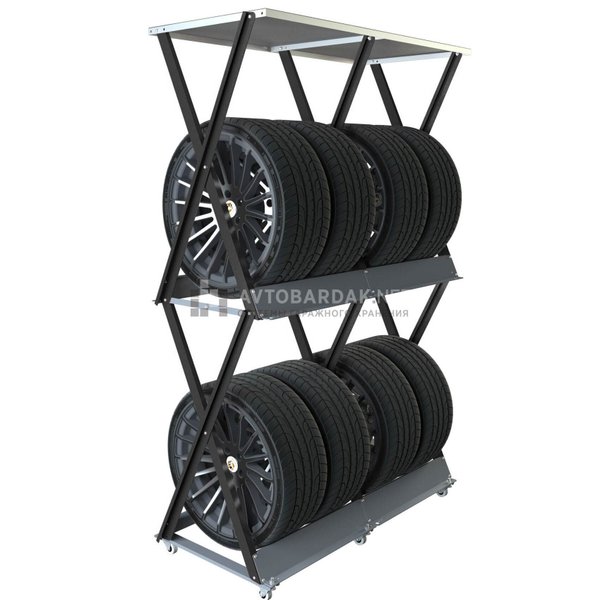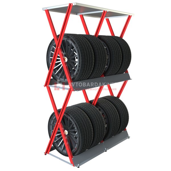 Стеллаж для хранения 8 колес состоит из 4 секций, вмещающих по 2 колеса.