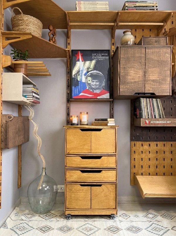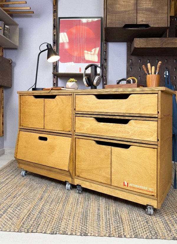 Ставим его или на тележку на колесиках или на другие ящики (модули). На модуль устанавливаем или столешницу или другой модуль.