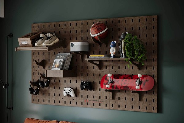 Настенный комплект в гостиную из 6 деревянных пегбордов модульной системы Woody System. Пегборды крепятся к стене, остальные элементы съемные: кронштейны с полками, деревянные и металлические крюки, полка для обуви.