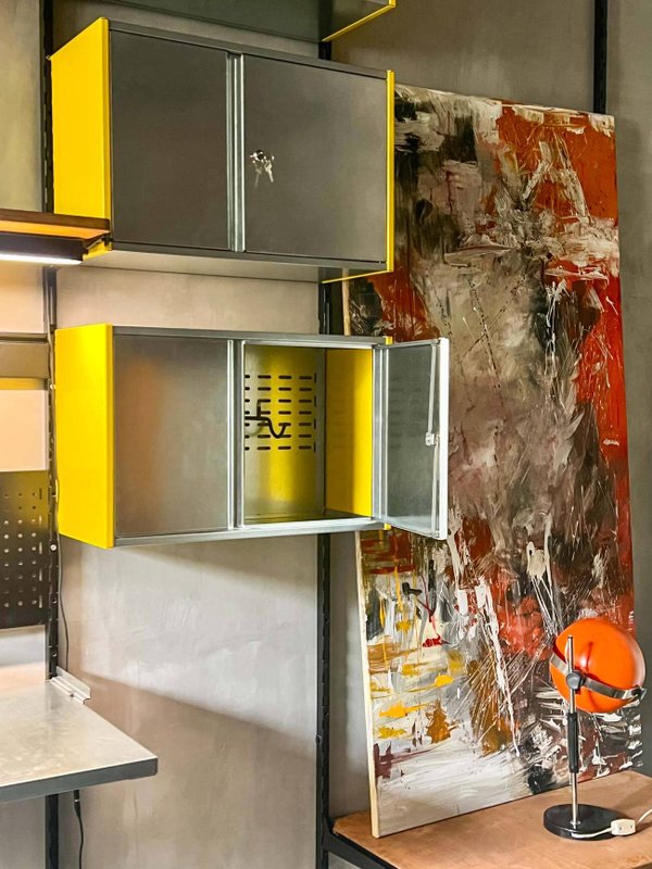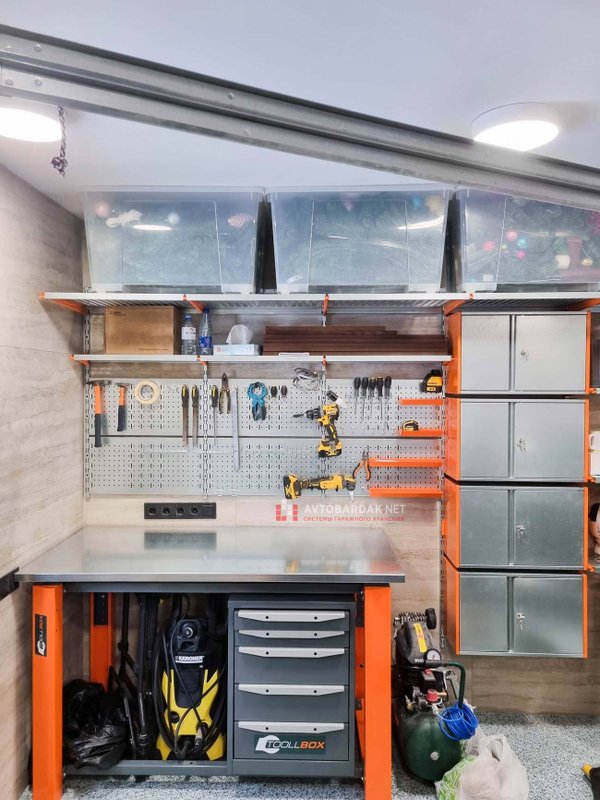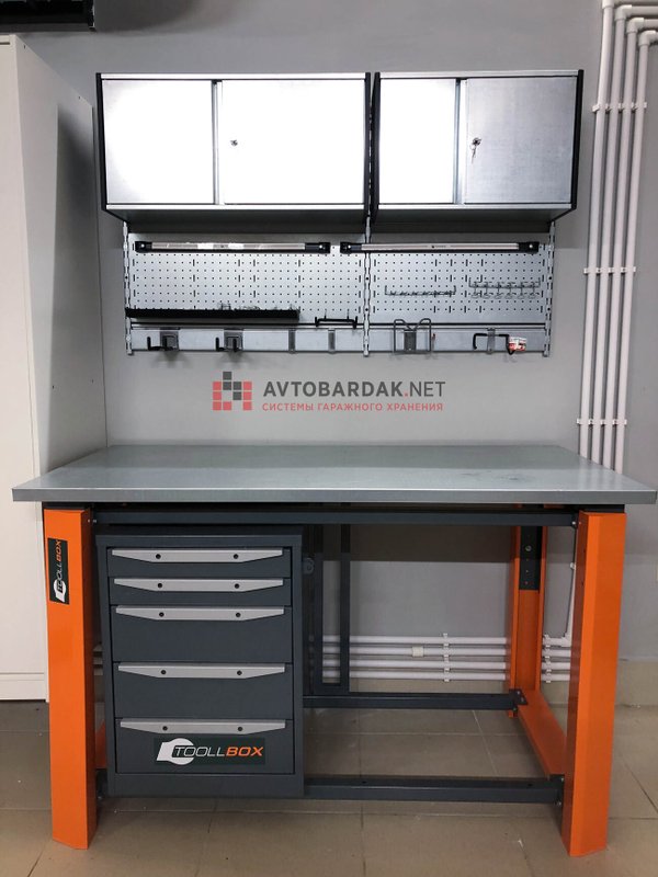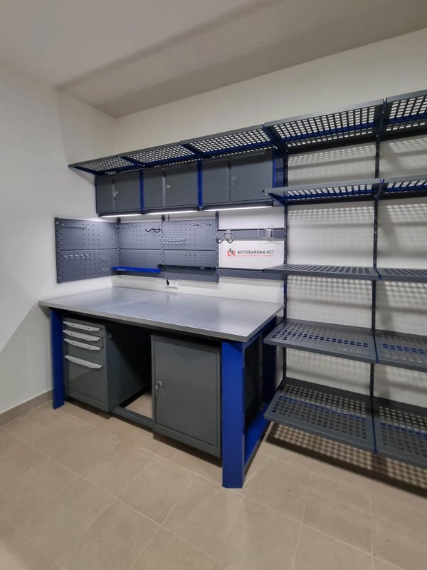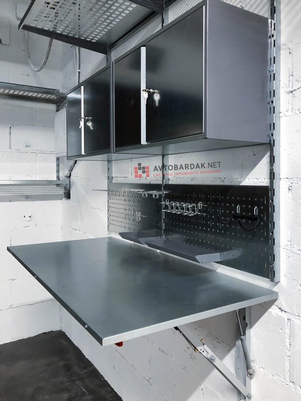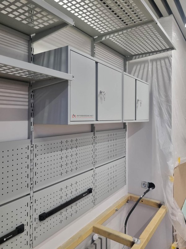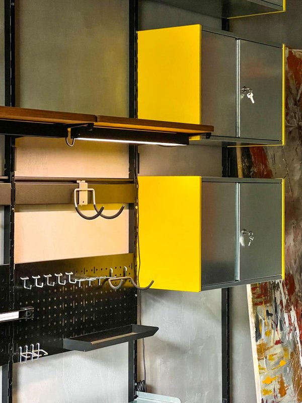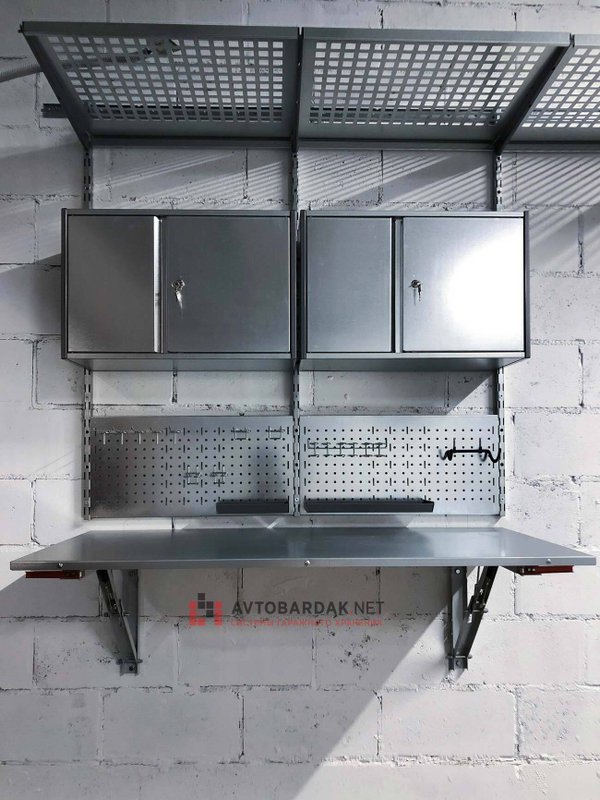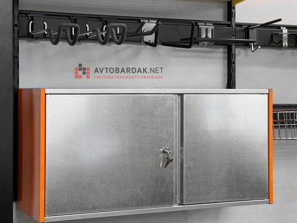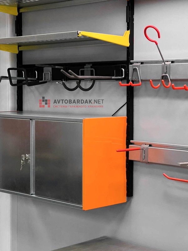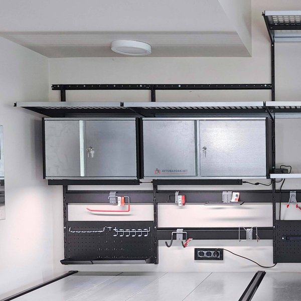 Шкафчики с дверцами защитят от пыли, случайного падения и посторонних глаз ценный инвентарь, который нежелательно выкладывать на открытые полки. Замок с парой ключей идет в комплекте.