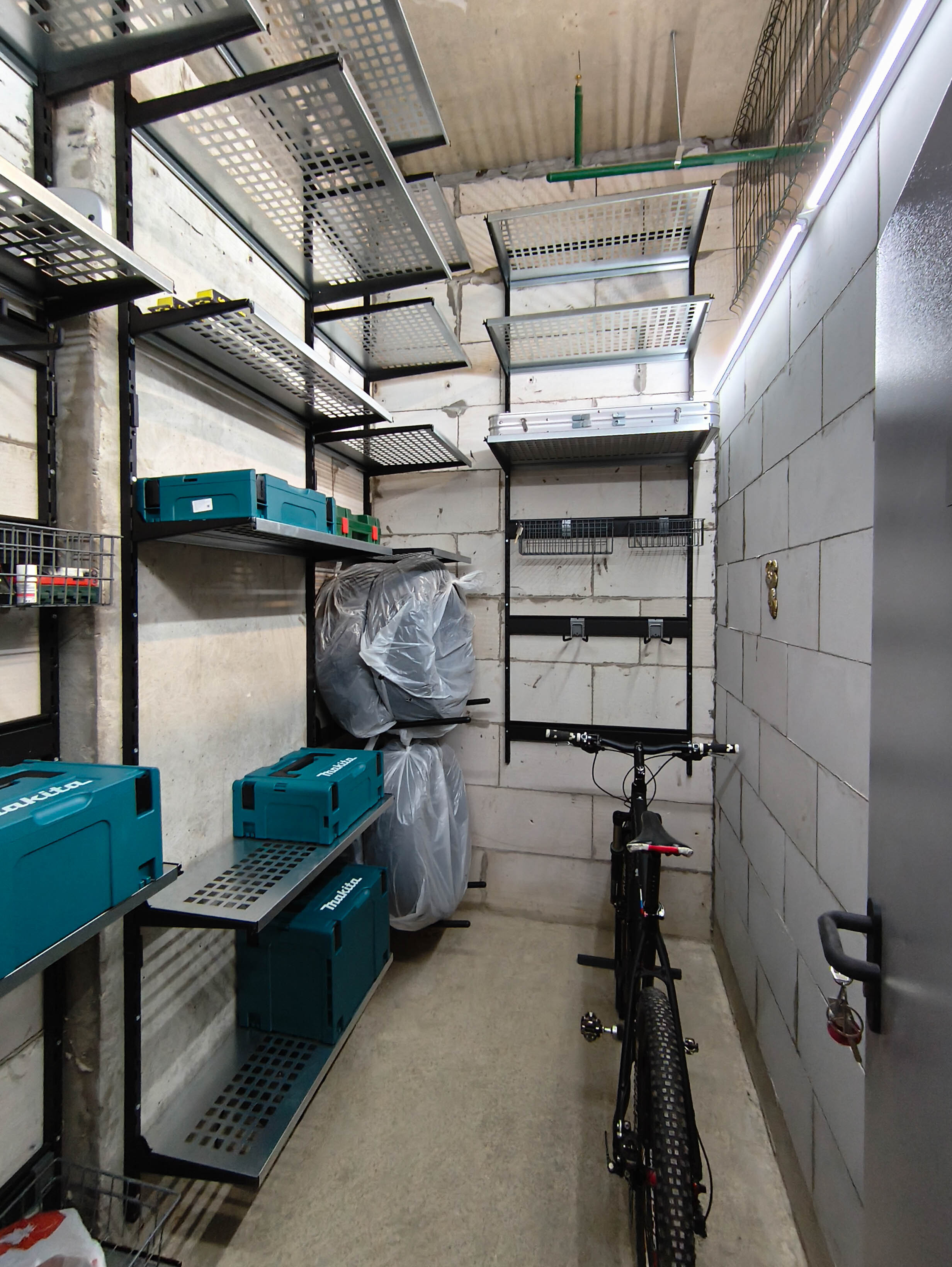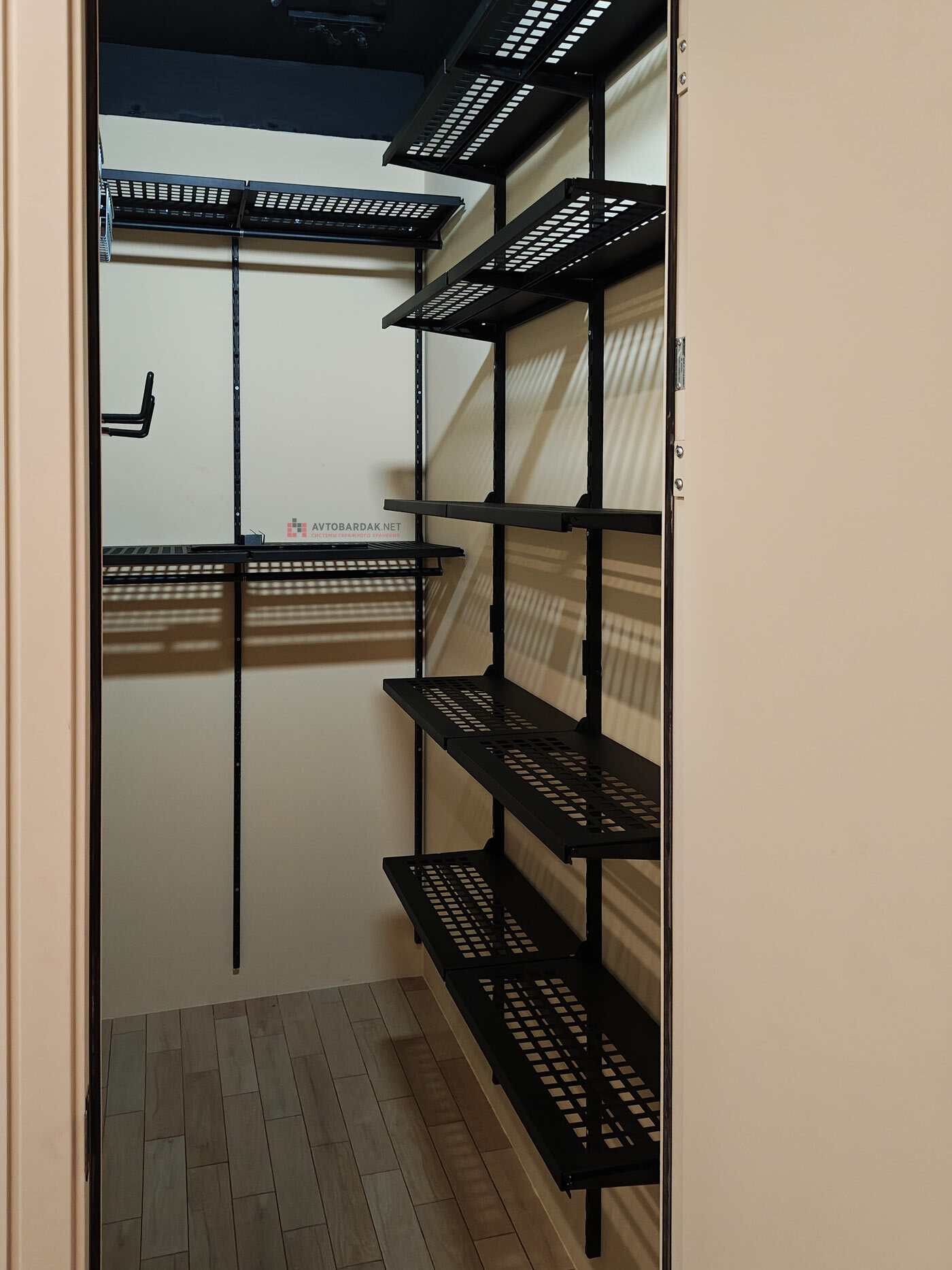 Кладовка со стальными полками черного цвета. На стенах закреплены прорезиненные блоки для хранения лыж. Установлены ряды металлических модульных полок. На одной из стены закреплены ряды рейлингов с крюками для подвеса шлемов, лыжных ботинок или коньков. Самокаты можно закрепить под полками на крюки.