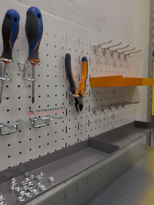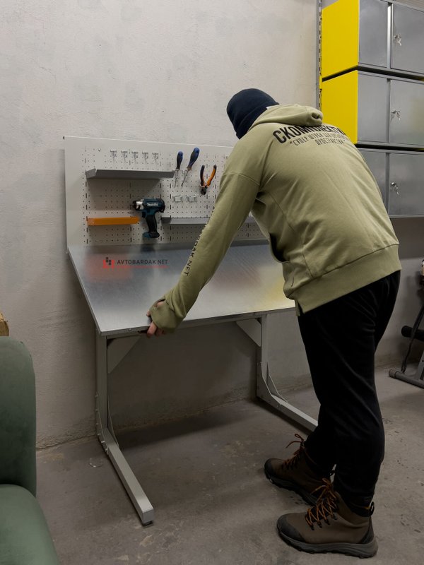 Верстак оборудован перфопанелью, на которую подходят для навески любые наши лотки и крючки. Крючки можно подобрать в этом разделе нашего каталога.