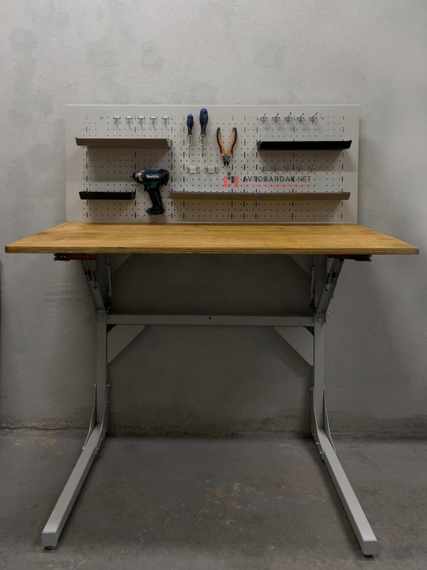 Обращаем ваше внимание, верстак поставляется в разобранном виде (отдельно рама с откидным кронштейном, отдельно ноги верстака и перфорированная панель).