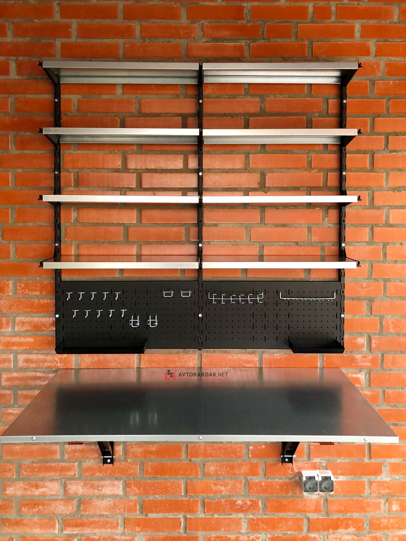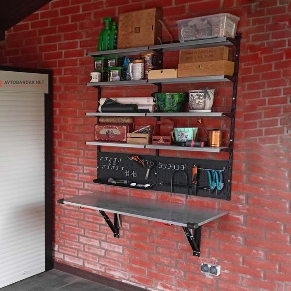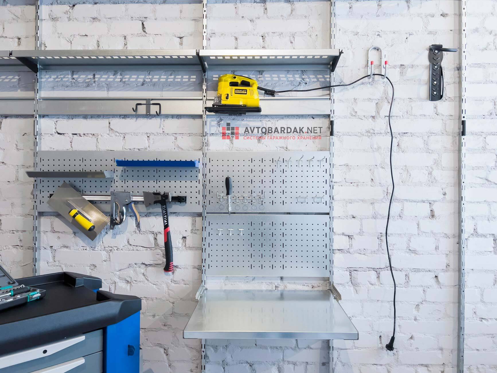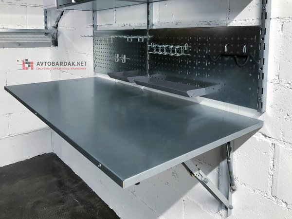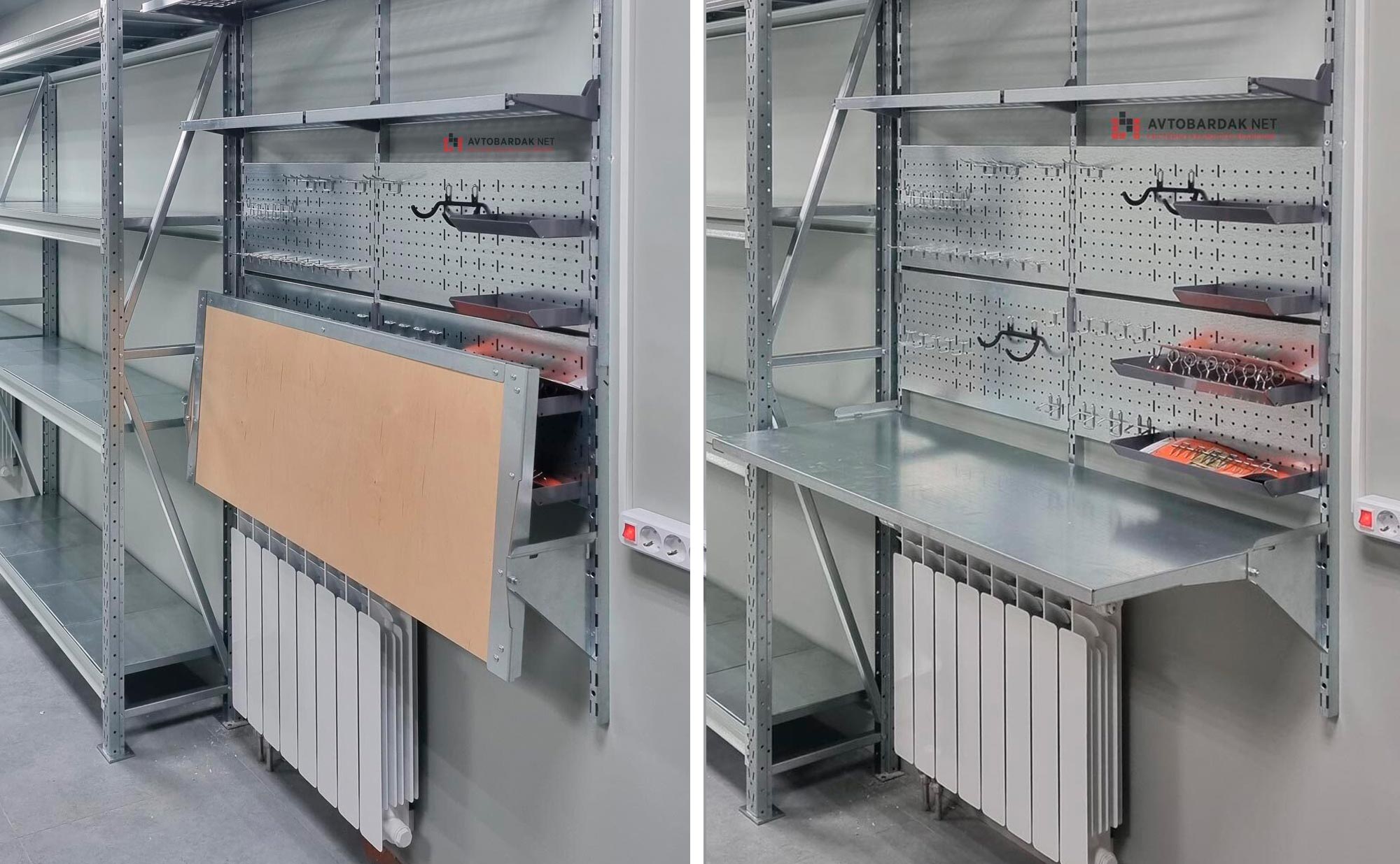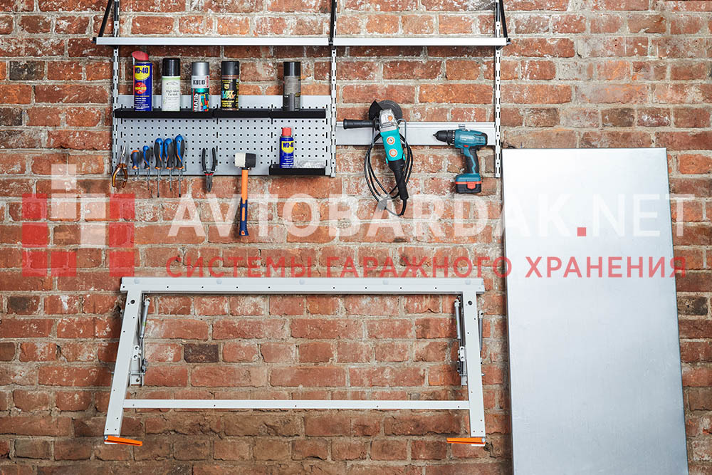 Пример обустройство гаража откидным столом, полками, перфопанелями для хранения инструментов