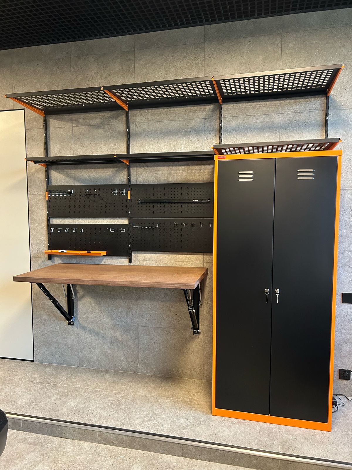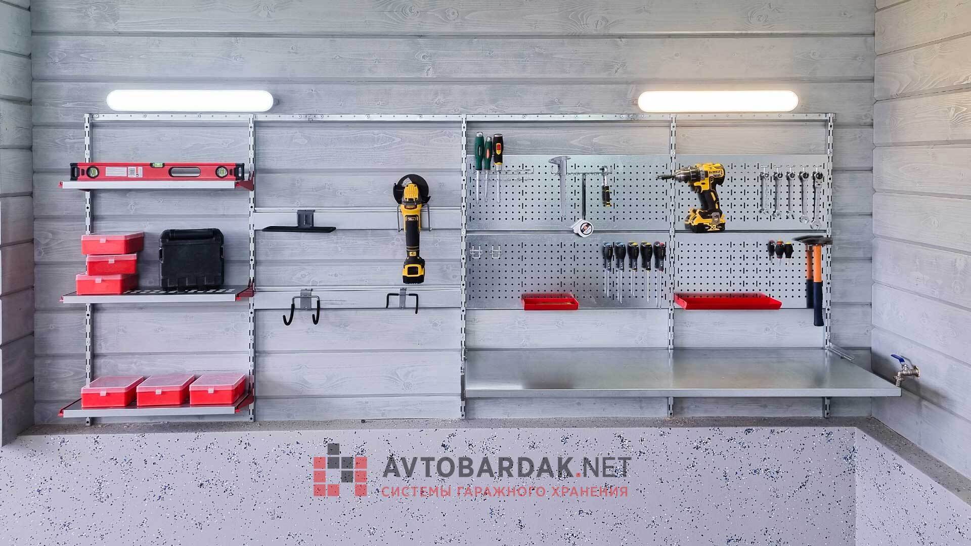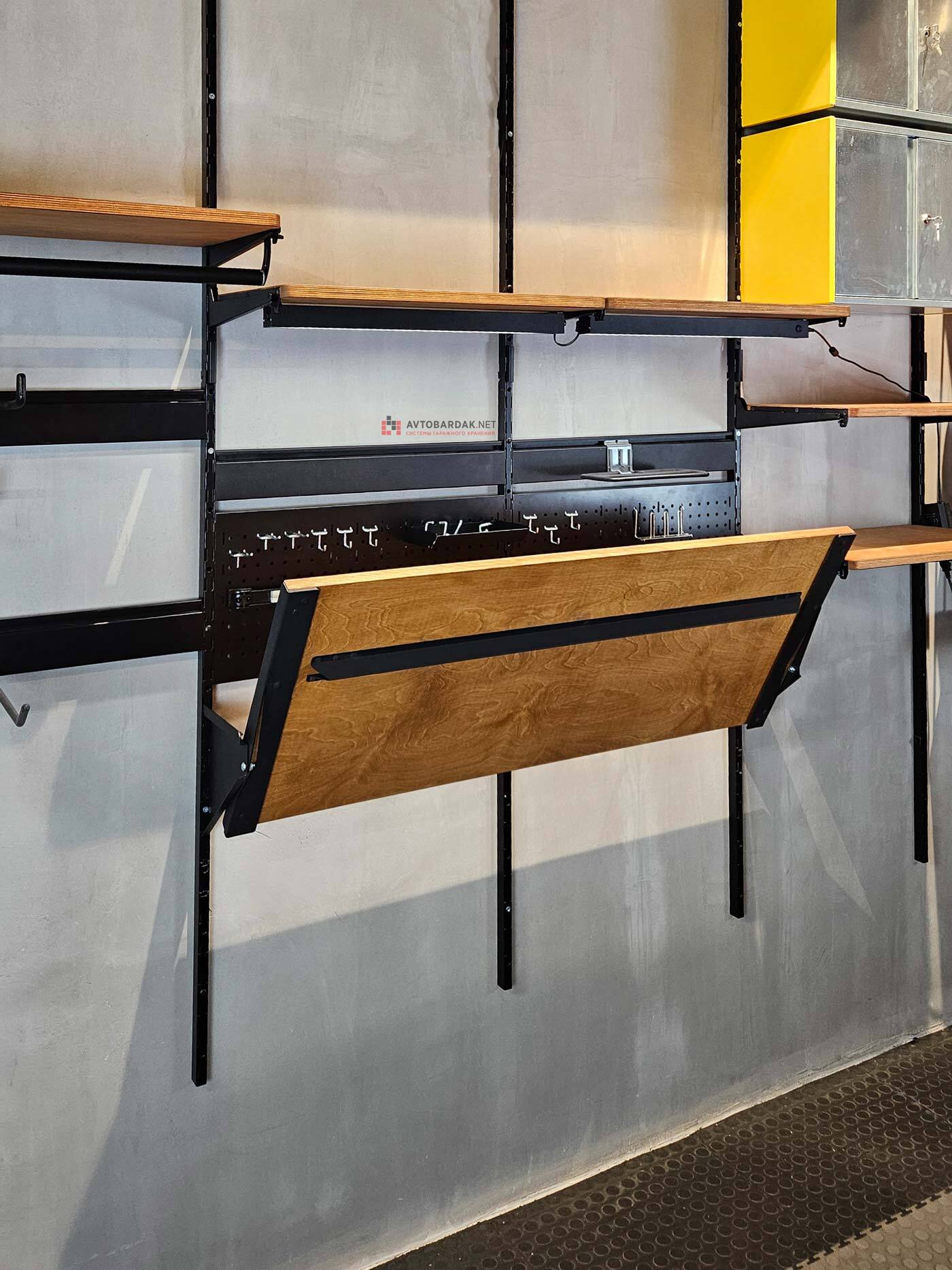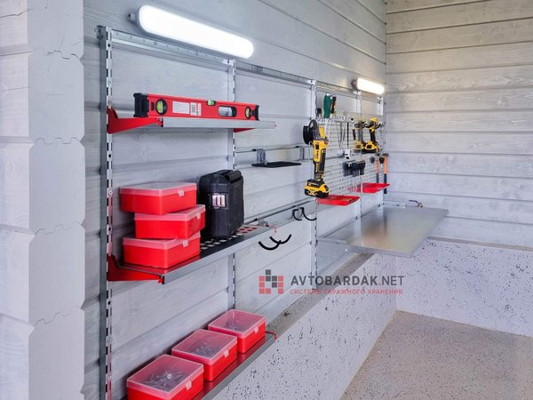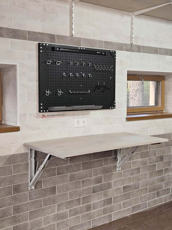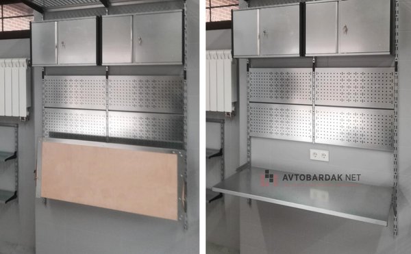 Пример обустройство гаража откидным столом, полками, перфопанелями для хранения инструментов