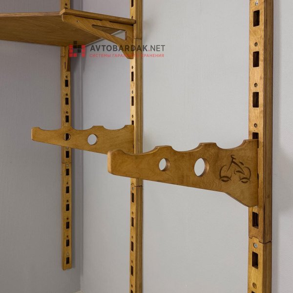 Деревянные велосипедные кронштейны с зацепами на вертикальные направляющие или пегборды системы хранения WD. Продаются парой, если вам нужен один кронштейн, то перейдите по ссылке. Пегборды и вертикальные направляющие продаются отдельно.