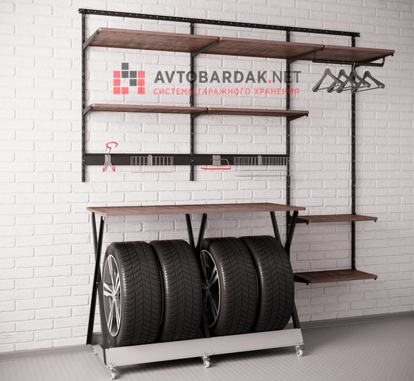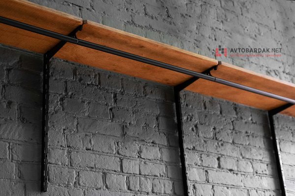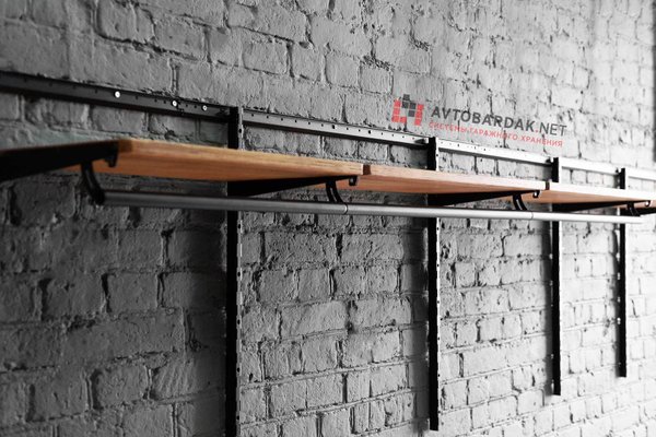 Перекладина устанавливается в отверстия в нижних частях полочных кронштейнов. Если в стеллаже одна полка, нам понадобится базовая секция. Если несколько деревянных полок в горизонтальном ряду, сначала устанавливается базовая перекладина под полку слева. И затем к базовой перекладине пристыковываются секции продления вправо (секция с одним зацепов в правой части перекладины.