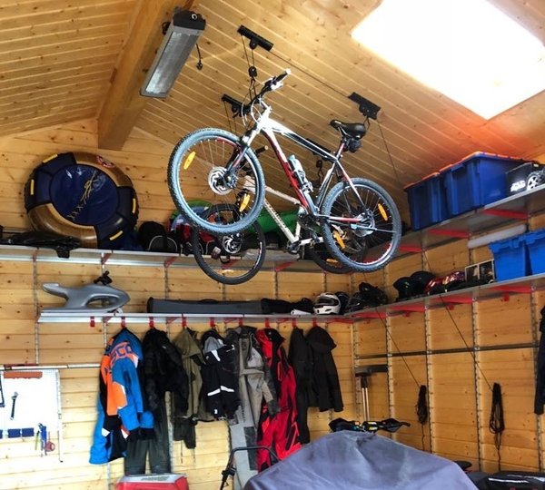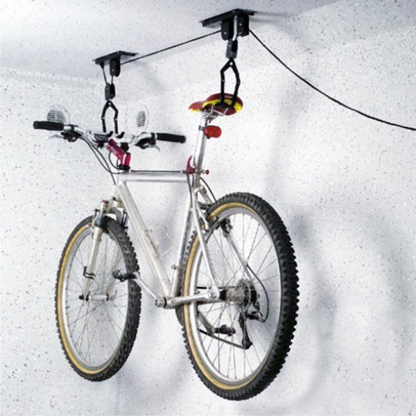 Потянув за веревку велосипед поднимается. Для фиксации велосипеда отведите веревку в сторону, активировав стопор (стопор работает, когда он не направлен горизонтально вниз). Механизм блокировки надежно удерживает веревку от высвобождения. Для того чтобы опустить велосипед, надавите свободным концом веревки на стопор так, чтобы он смотрел вниз, и медленно отпускайте веревку.